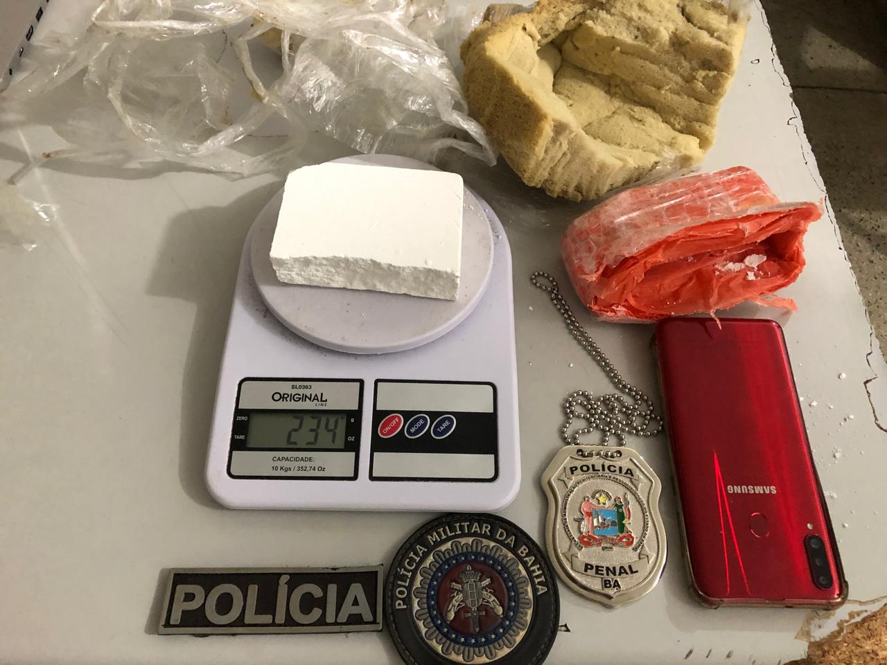 Em seguida um pacote foi localizado após buscas realizadas em conjunto entre Policia Militar e Policia Penal com acompanhamento do chefe de segurança do presídio. Material localizado: