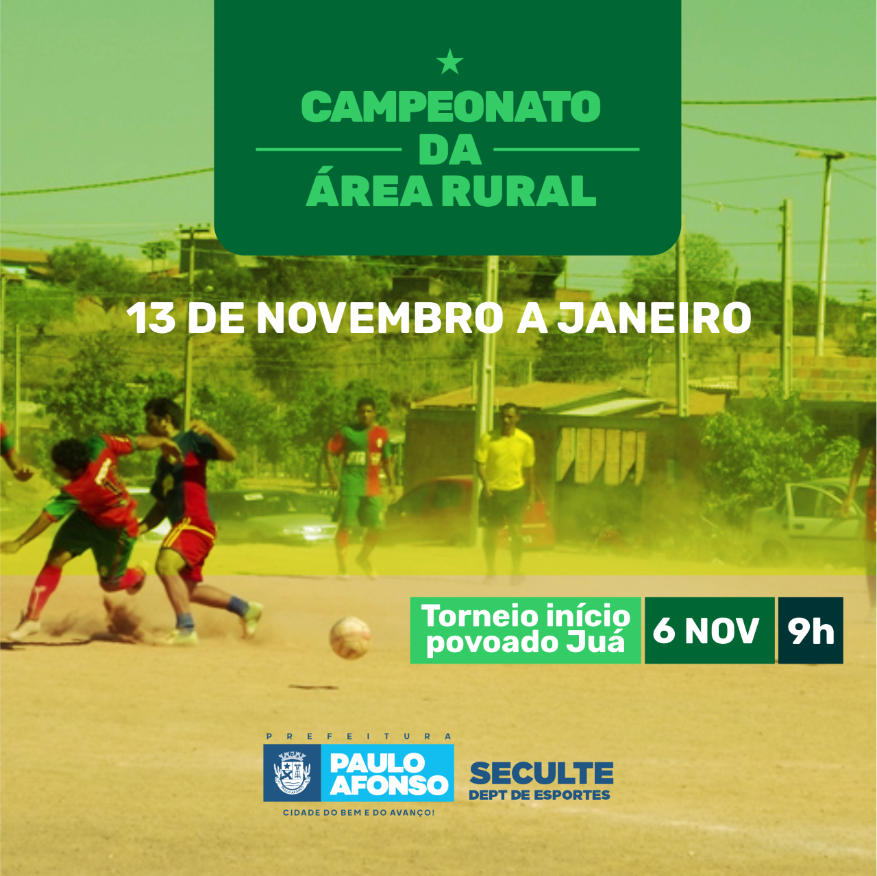A partir de novembro a área rural entra em festa com o Campeonato da Área Rural, que tem o seu torneio início no povoado Juá, no dia 6, às 9h. As rodadas acontecem no dia 13 e seguem até janeiro, com 22 equipes e 550 atletas. Além do Juá, mais três povoados sedes comportarão os jogos -Malhada Grande, Logradouro e São José.