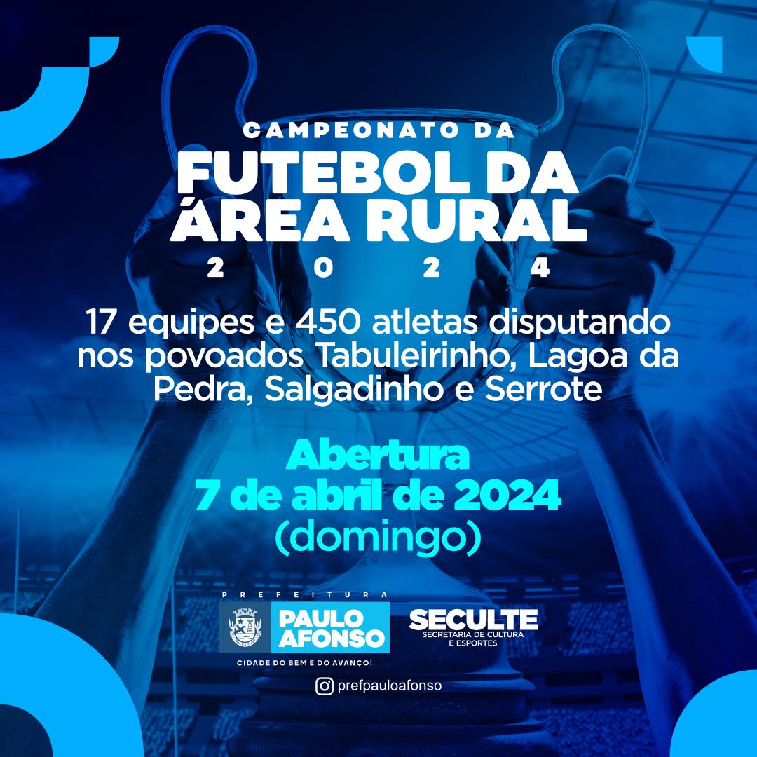 No dia 7 de abril será realizada a abertura do Campeonato de Futebol da Área Rural 2024. O evento contará com a participação de 17 equipes e 450 atletas.