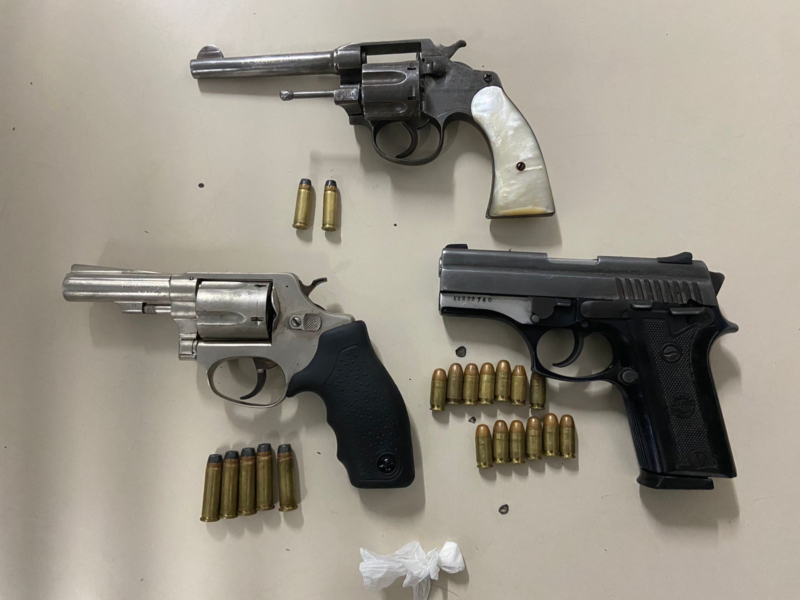 01 – Revólver Taurus calibre 38, numeração CA34552 01 – Revólver CZ calibre 32, numeração 297536 01 – Pistola Taurus calibre 938, numeração KKS22740 01 – Munição CBC calibre 38, numeração 05 01 – Munição CBC calibre 32, numeração 02 01 – Munição CBC calibre 380, numeração 13 DROGAS APREENDIDAS: