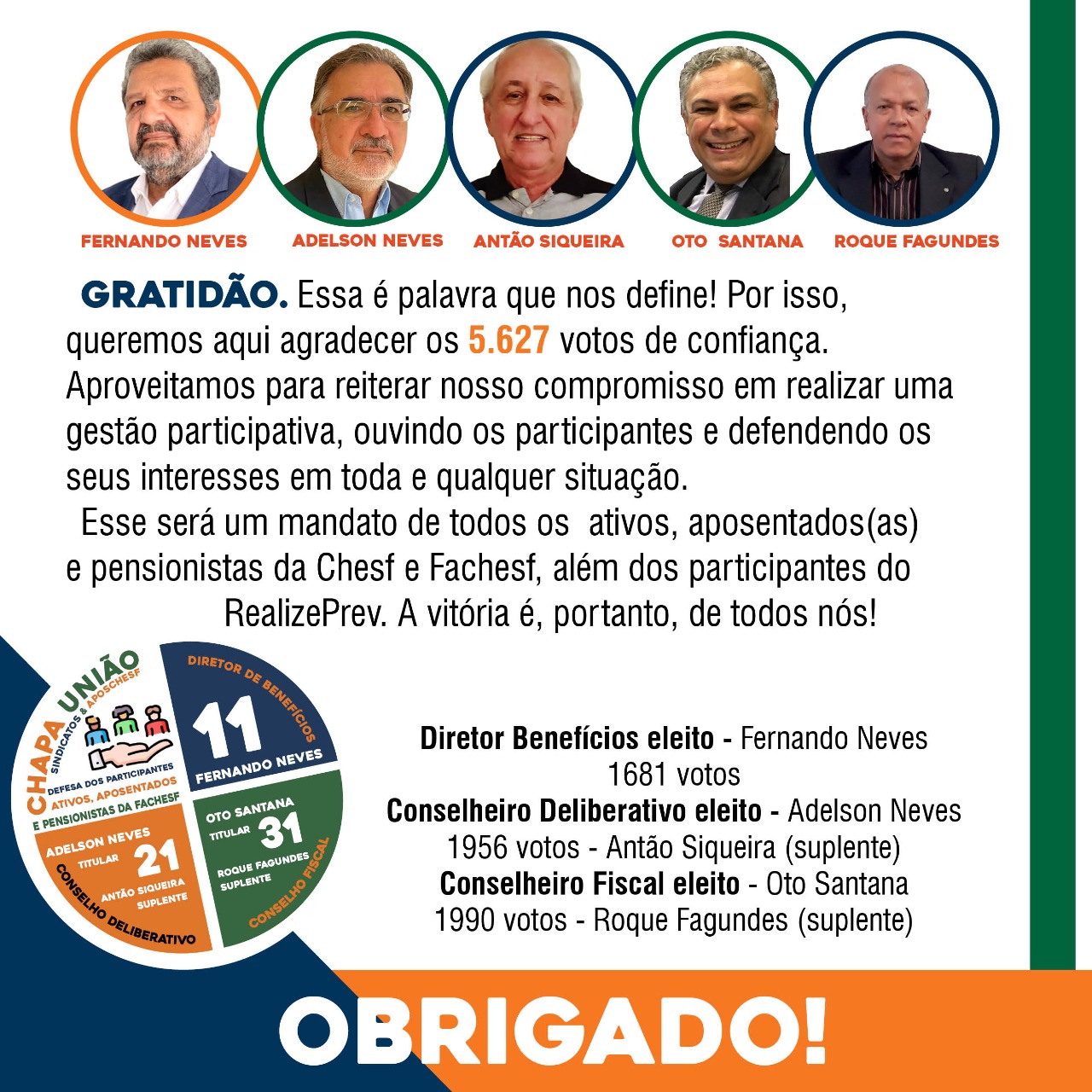 A votação ocorreu de modo 100% online. O formato eletrônico permitiu que todos exercessem seu direito de voto com comodidade e segurança, os eleitores utilizaram a mesma senha de acesso à área restrita do site da Fachesf. O resultado ficou da seguinte ordem.