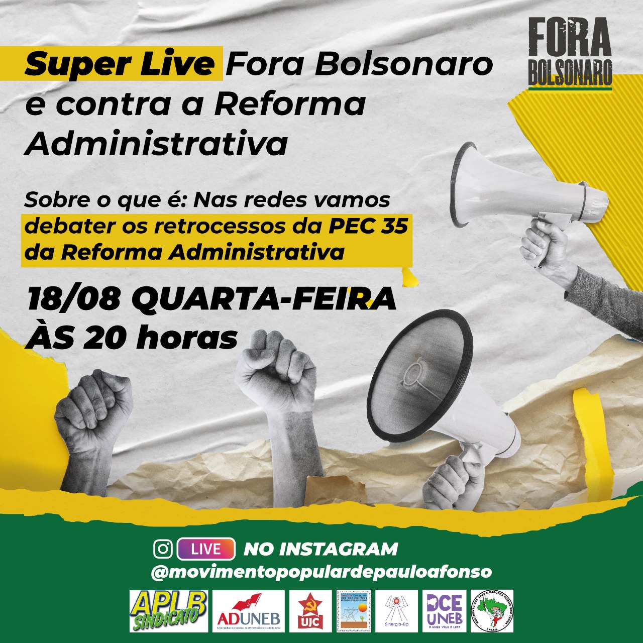A organização convida todos ã participarem da Live Fora Bolsonaro e Contra a Reforma Administrativa. Nesta quarta, dia 18, a partir das 19h. Assista no Instagram www.instagram.com/movimentopopulardepauloafonso