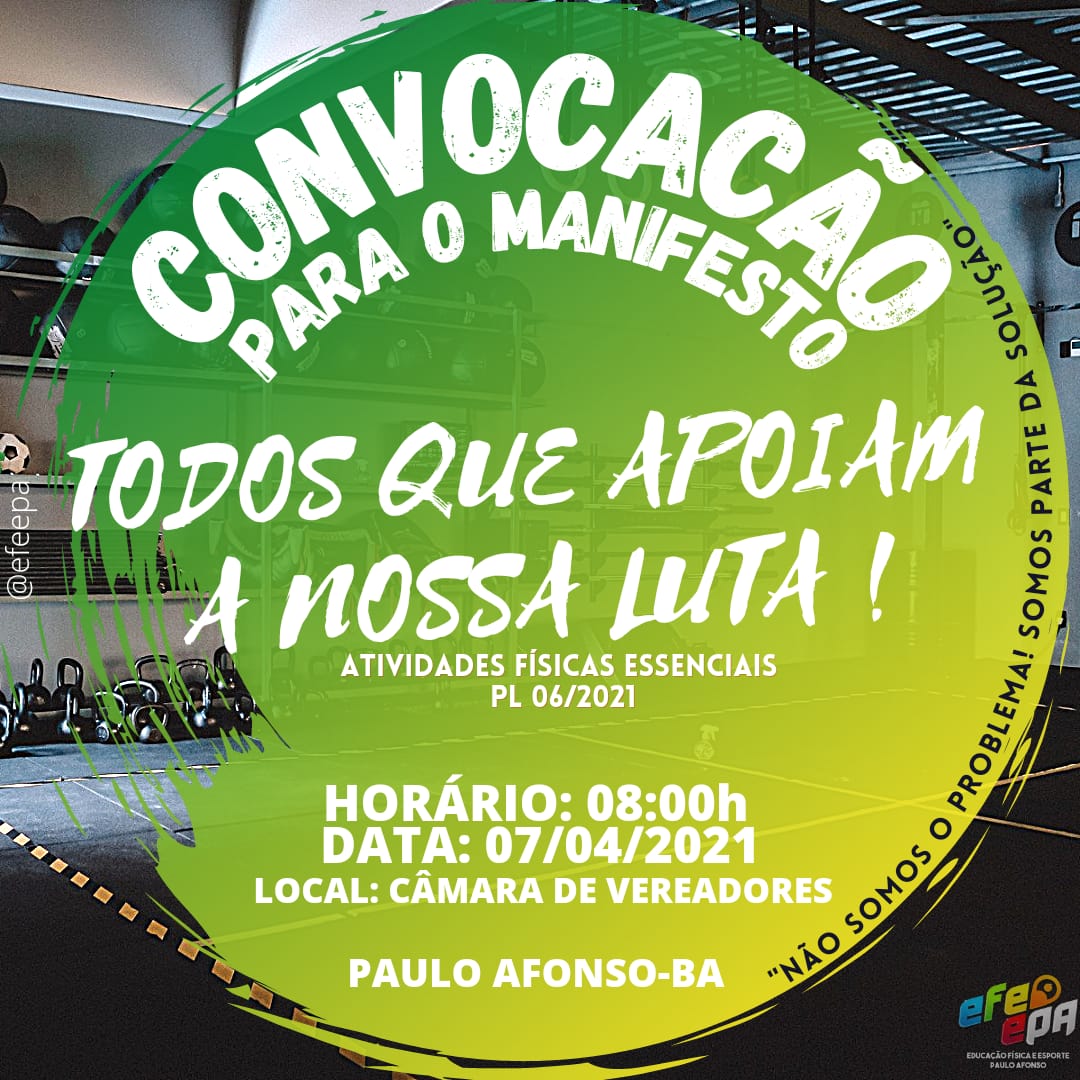Professores de Educação Física, Alunos e proprietários de Academias estão realizando uma “Convocação Para Manifesto” para amanhã 07 de abril de 2021 às 08h em frente a Câmara Municipal de Vereadores de Paulo Afonso Bahia a fim de solucionar a problemática do fechamento das academias.