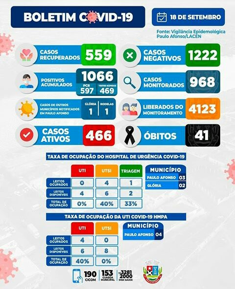 Os números só aumentam de infectados pelo Covid-19 em Paulo Afonso Bahia como mostra a tabela do Boletim Epidemiológico emitido hoje 18 de setembro de 2020 pela Prefeitura Municipal através da Secretaria de Saúde do Município.