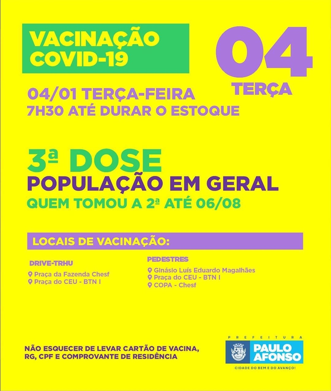 Paulo Afonso-BA: Covid-19-Terceira dose da vacina amanhã 04/01