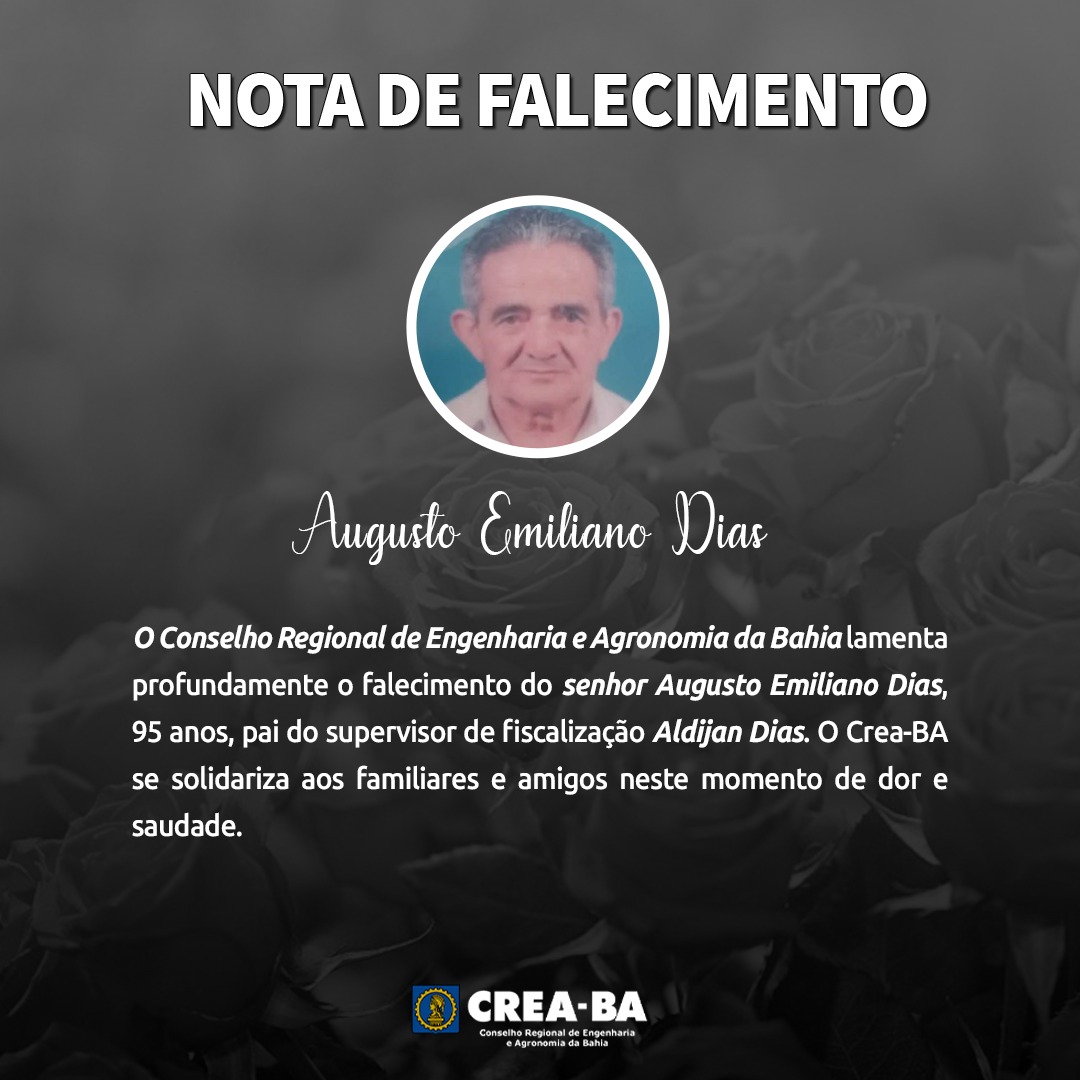 Hoje 18 de agosto de 2021 o CREA Bahia emitiu Nota de Pesar pelo falecimento do Senhor Augusto Emiliano Dias, pai do Servidor Supervisor de Fiscalização Aldjan Dias. Seu Augusto de 95 anos era uma pessoa muito conhecida na cidade de Paulo Afonso Bahia.