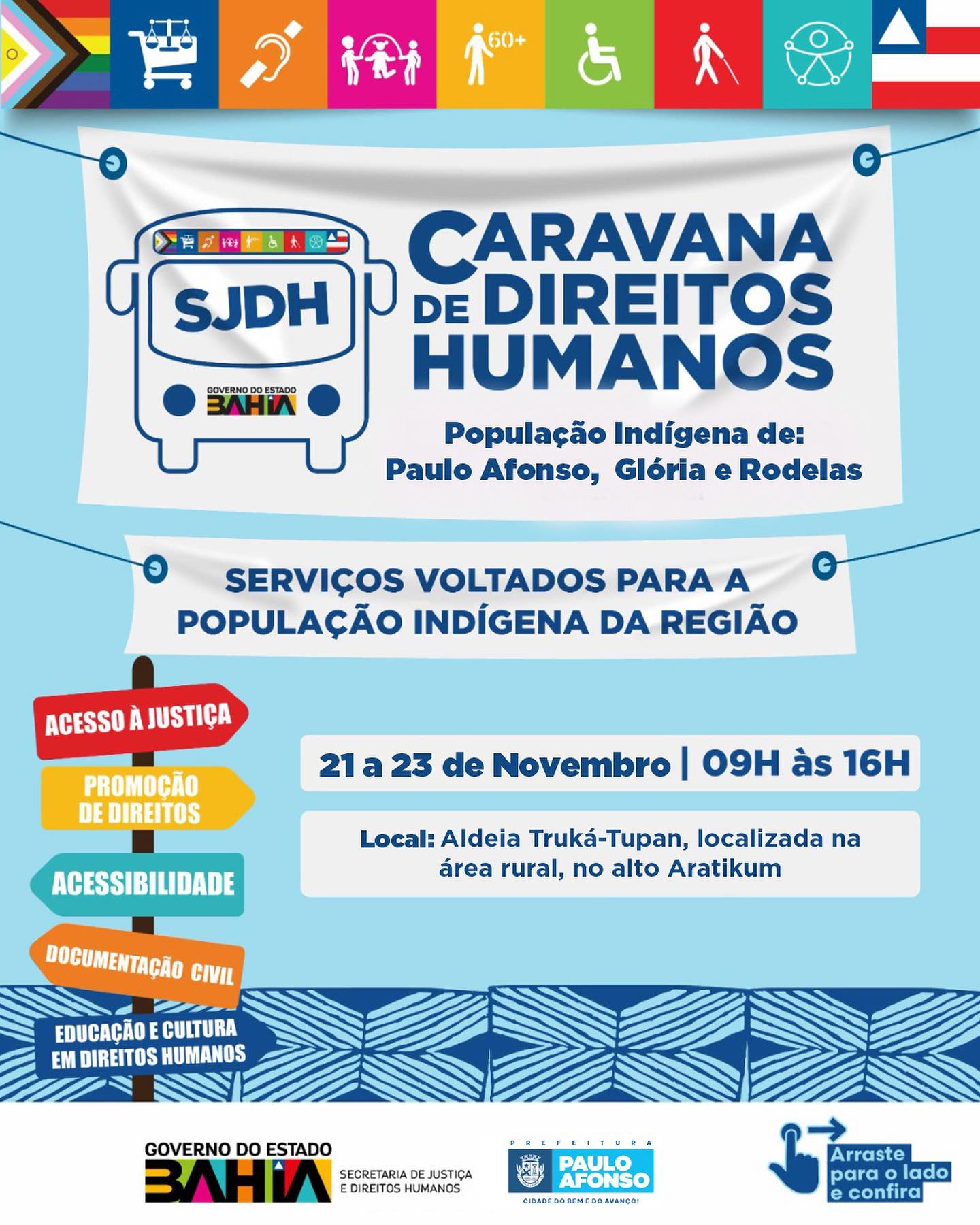 A população indígena de Paulo Afonso, Glória e Rodelas será beneficiada com a Caravana de Direitos Humanos. A ação acontece de 21 a 23 de novembro,das 9h às 16h, na Aldeia Truká-Tupan, localizada no alto Aratikum, em Paulo Afonso, com diversos serviços.