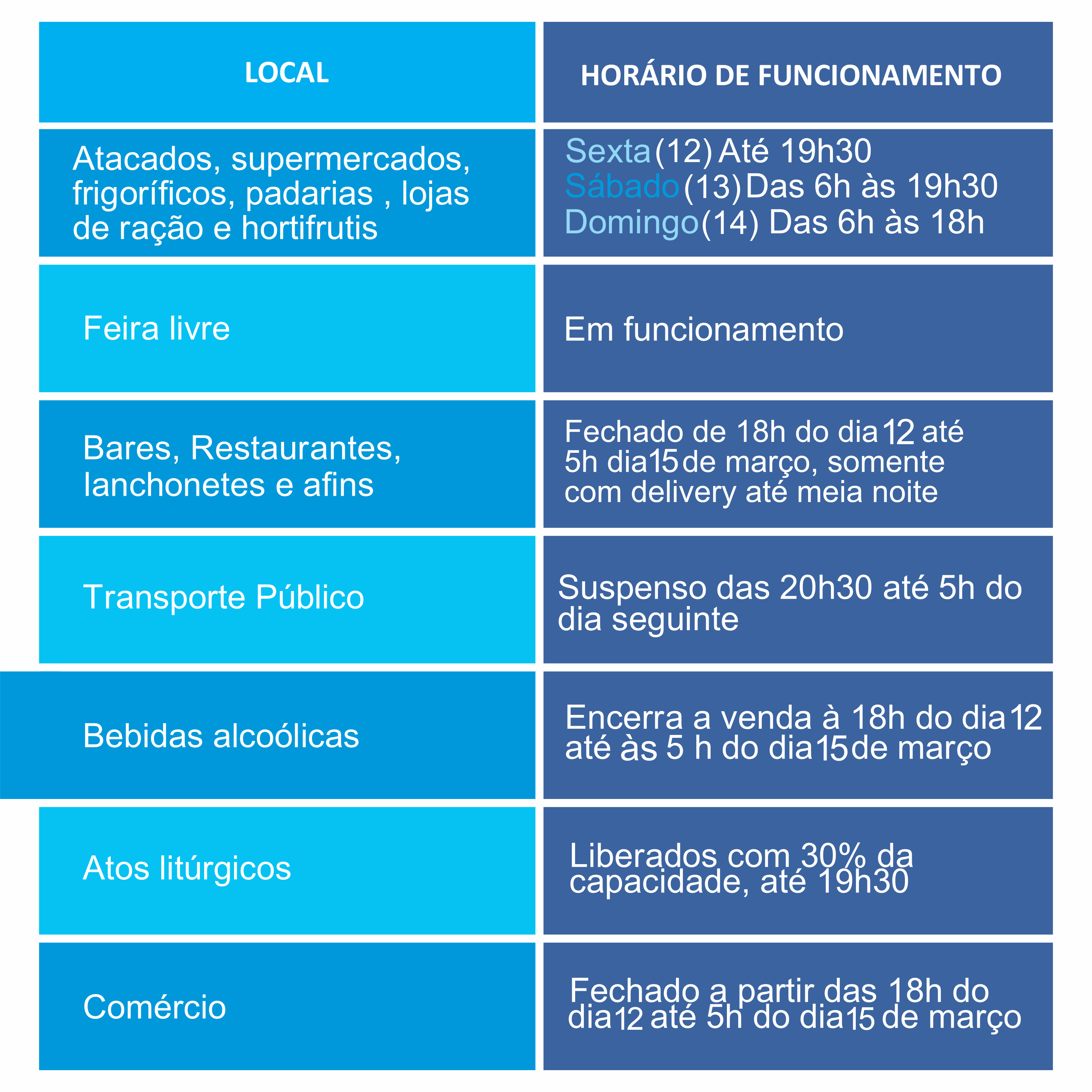 – Fechamento do comércio, das 18h do dia 12 de março, até́ às 05h do dia 15 de março;