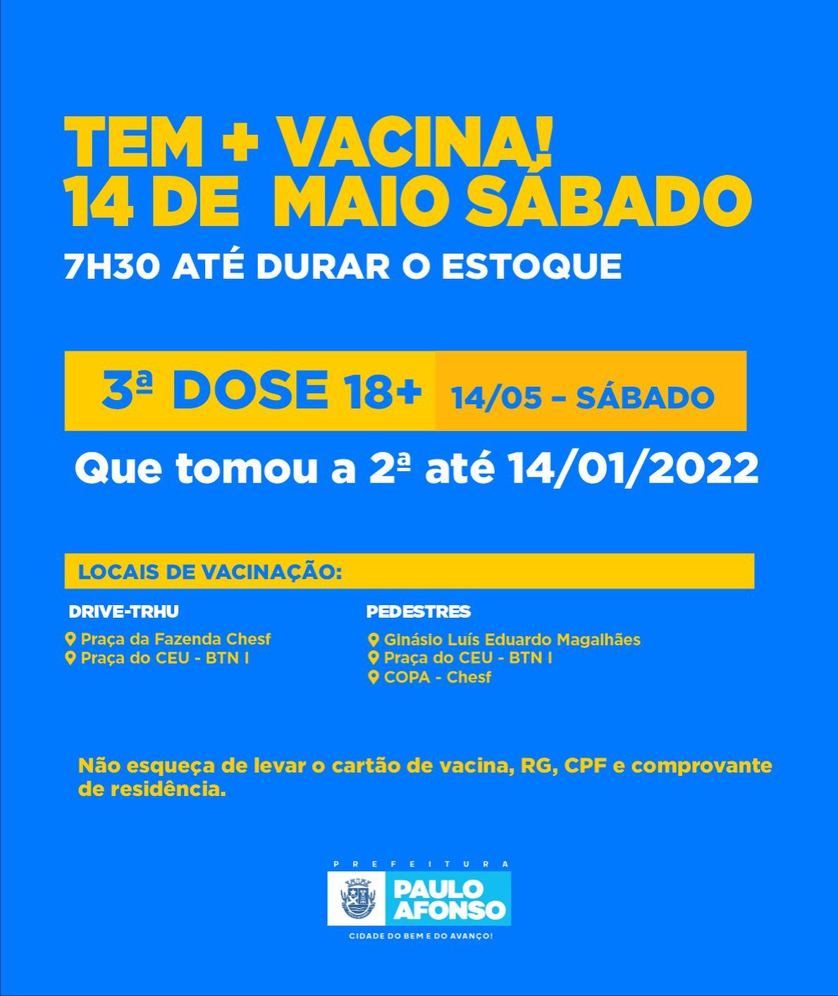 A Prefeitura Municipal de Paulo Afonso Bahia através da Secretaria Municipal de Saúde convoca jovens de 18+ para tomar a Terceira Dose da Vacinação contra o Coronavirus neste sábado 14 de maio de 2022. Será para quem tomou a 2ª até o dia 14 de janeiro. As informações todas aí no card!