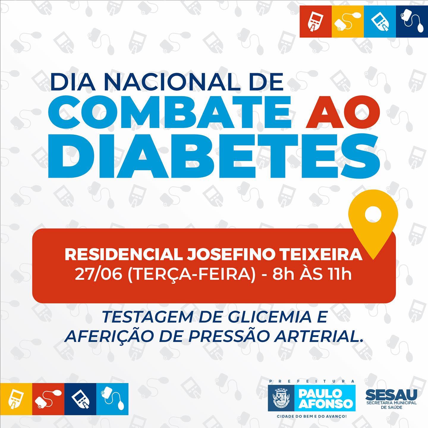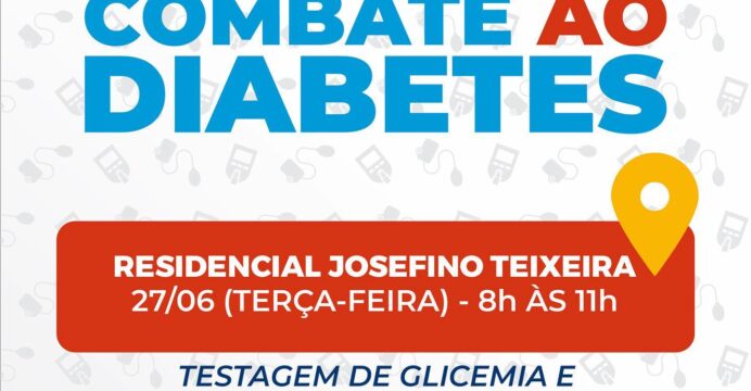 Nesta terça-feira (27), em alusão ao Dia Nacional de Combate ao Diabetes, os residentes da saúde da família vinculados ao posto Santa Inês, estarão realizando uma ação nas imediações do Residencial Josefino Teixeira, localizado no Bairro Tancredo Neves III.