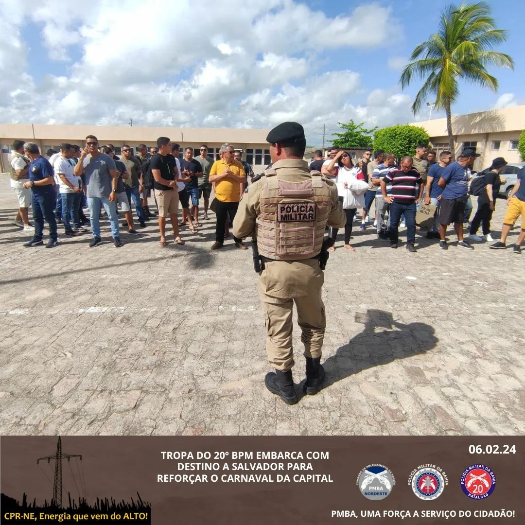 Nesta terça-feira (06), às 09h, parte da tropa do 20º BPM embarcou rumo a Salvador para reforçar o Carnaval 2024, sob a supervisão do Cap PM Campos, o qual fez a conferência do efetivo. Toda a tropa do 20º BPM estará empenhada em reforçar a segurança durante os festejos. A outra parte do efetivo que não irá para a Capital irá reforçar o Carnaval paralelo em Paulo Afonso, Jeremoabo e Rodelas.