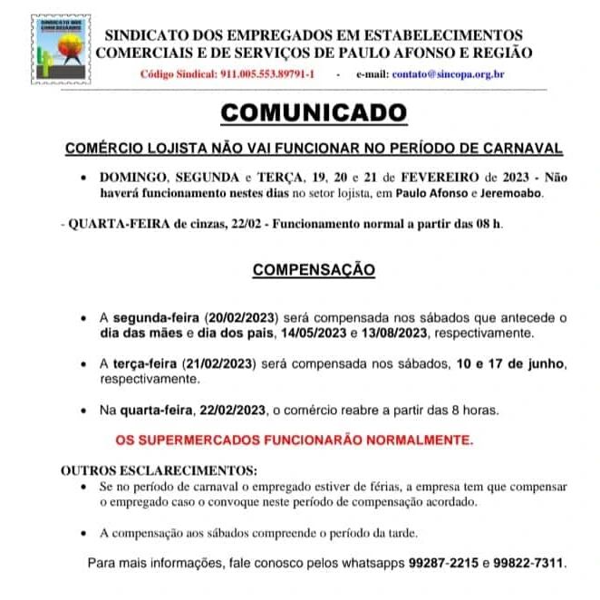 Amanhã 09 de fevereiro de 2023 as 09h no Programa Sala de Imprensa da Rádio Web Caiçara recebe Jurandir Roque, Presidente do Sindicato dos Comerciários de Paulo Afonso e Região a fim de informar o funcionamento do comércio Lojista e de Supermercados.