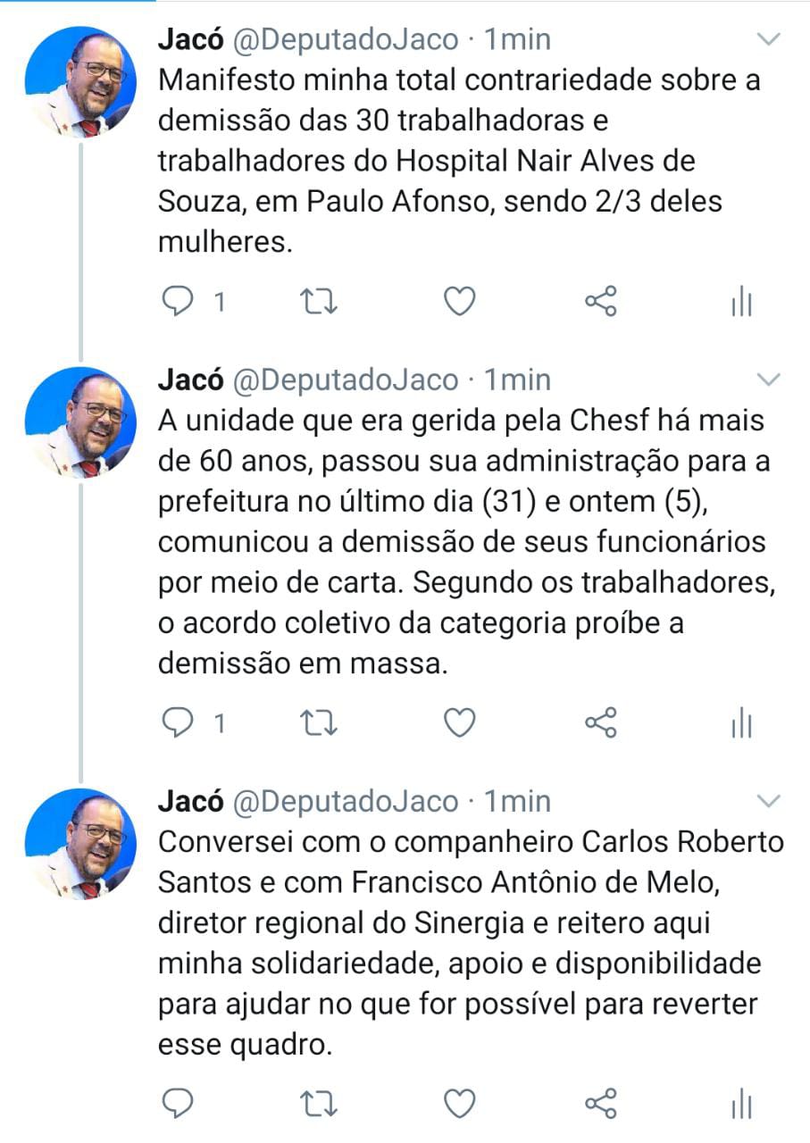 O deputado estadual baiano Jacó Lula da Silva-PT, repudiou tal atitude da Chesf por esta se eximir de sua responsabilidade com o HNAS, bem como pelas demissões arbitrarias dos trabalhadores e trabalhadoras da saúde, justamente nesse período de Pandemia do Covid-19. Jacó se prontificou a ajudar o Sinergia na luta em prol dos trabalhadores; reiterou sua solidariedade, apoio e disponibilidade para ajudar no que for possível para reverter esse quadro.