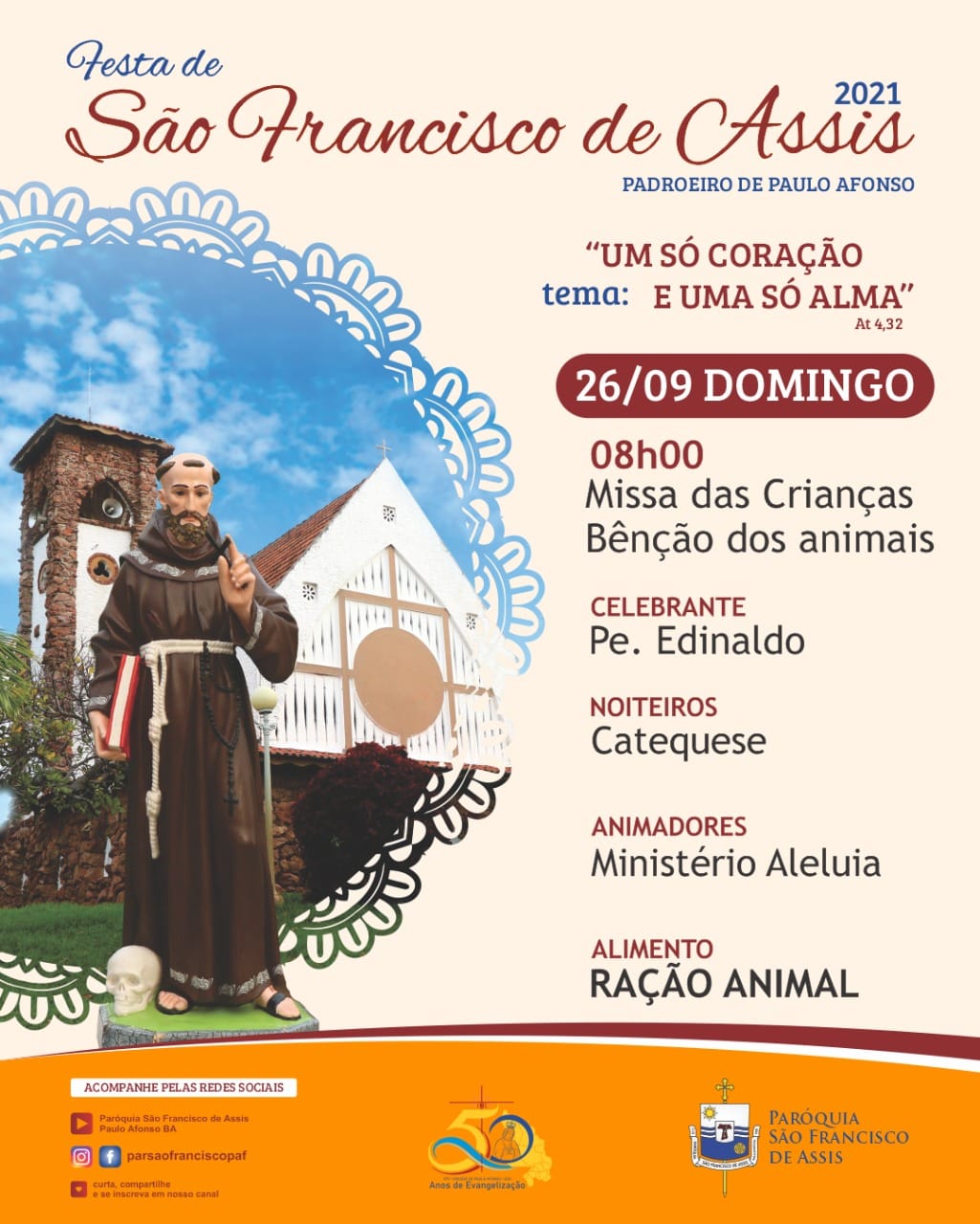 Dando continuidade a tradição, a Festa de São Francisco de Assis 2021, o Padroeiro de Paulo Afonso Bahia vai acontecer dia 26 de setembro domingo. A Programação será apenas um dia, com o Tema: “Um só Coração e uma só Alma”.