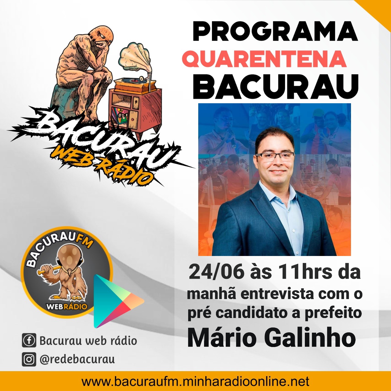 O Vereador e Pré Candidato a Prefeito Mário Galinho (SD) será o entrevistado do Programa Quarentena BACURAU na Web Rádio Bacurau FM. O programa é apresentado por Thales Vilar e tem como finalidade, esclarecer diversos pontos de interesse da sociedade, com discussões políticas, infraestrutura, cultura, educação, saúde, esporte, entre outros assuntos.
