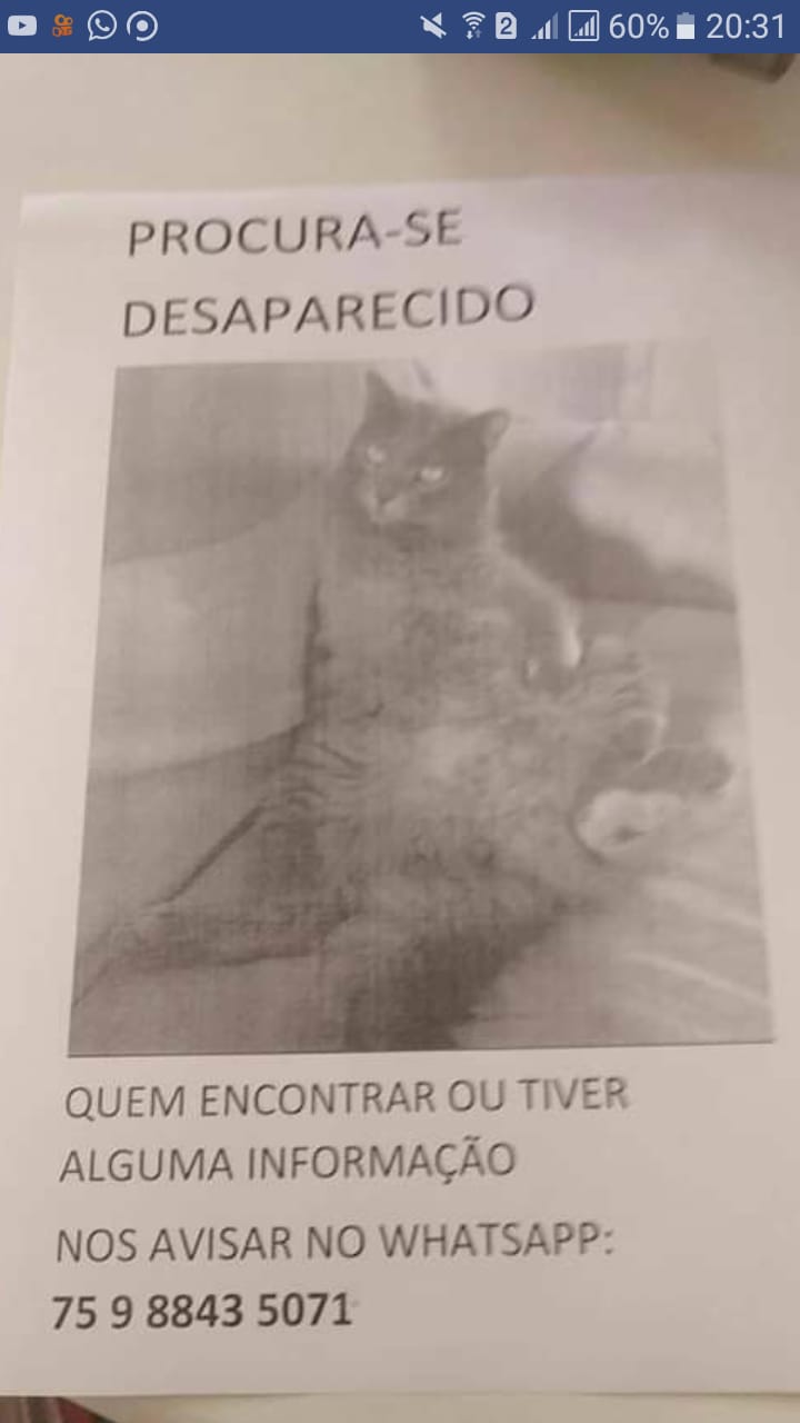 Familiares estão sofrendo com seu desaparecimento, quem encontrar ou souber informações entrar em contato pelo WhatsApp (75) 98843-5071. O animal é de estimação e precisa de cuidados especiais por ser deficiente. Ajudem essa família a encontrar seu animal.
