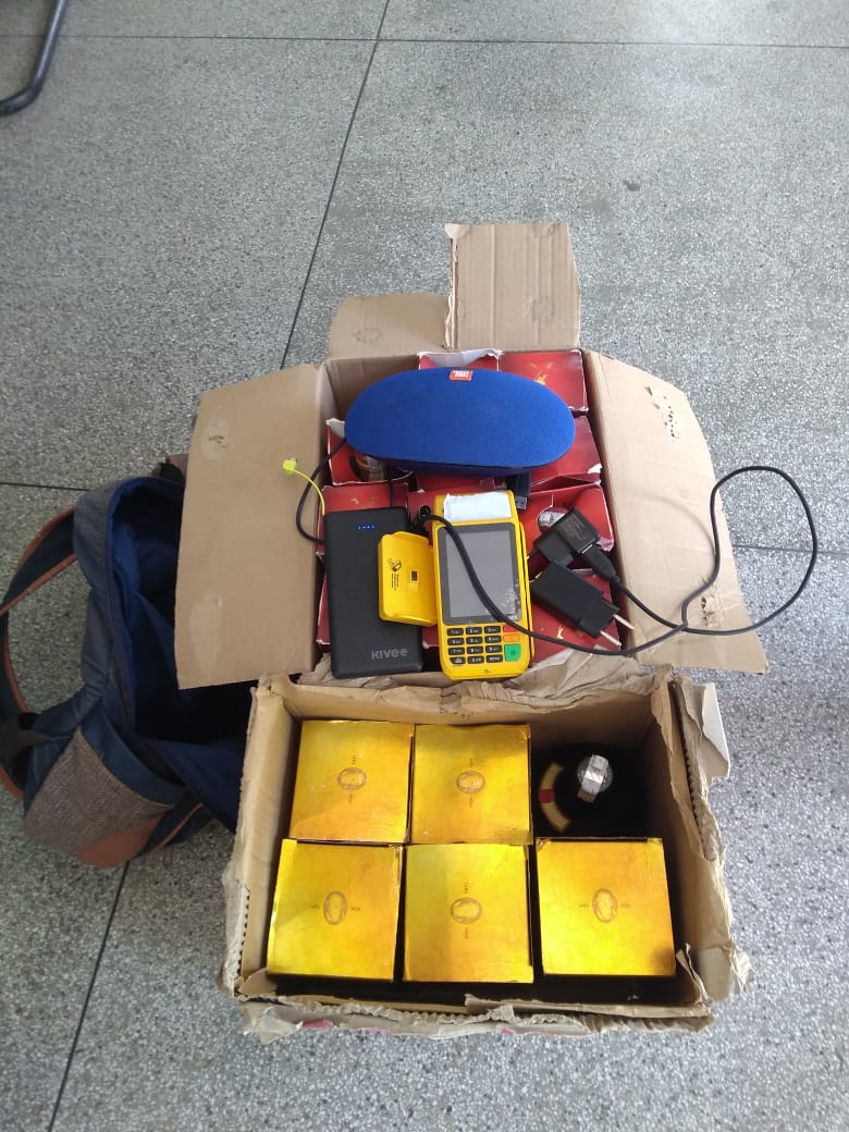 01 caixa de som JBL. 01 máquina de cartão de crédito. 01 carregador portátil. 01 mochila de costas. 11 garrafas de whisky Red Label. 06 garrafas de Whisky Old Par.