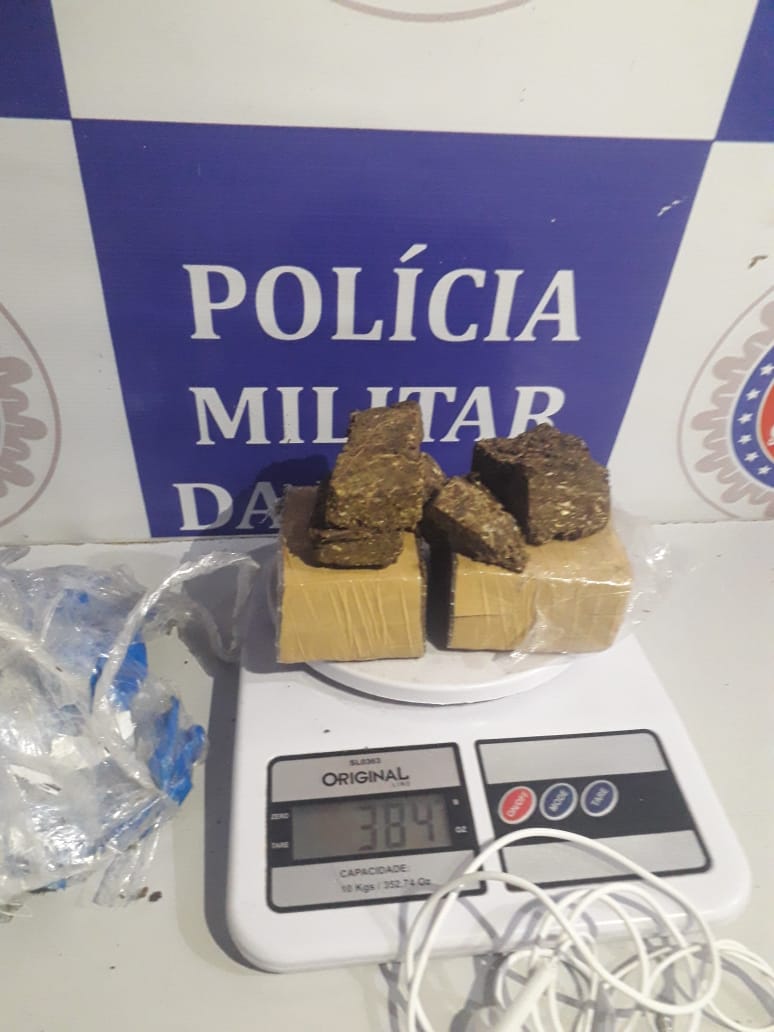 384 gramas de Material Análoga a Maconha Prensada e 01(um) fone de ouvido de cor branca.