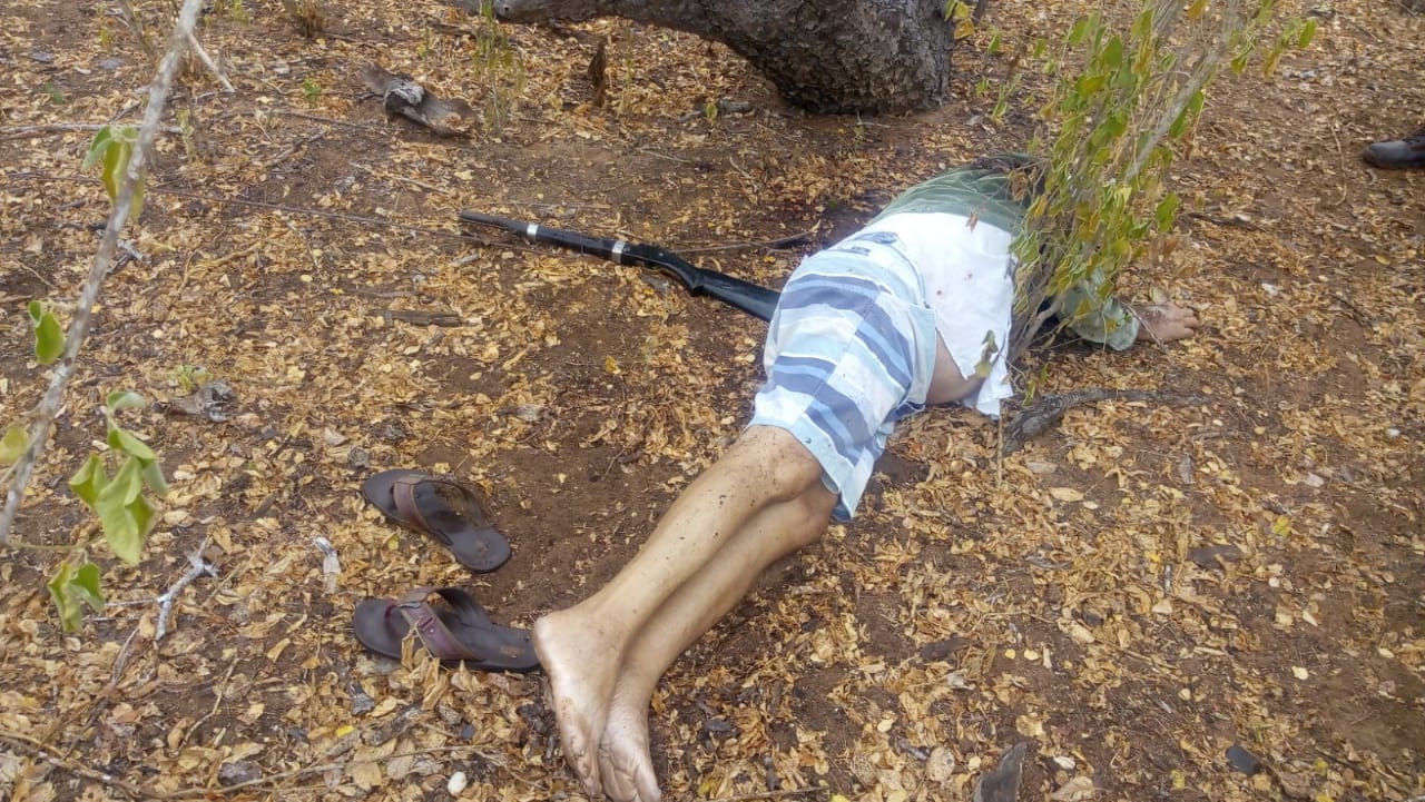 Chegando ao local mantiveram contato com o irmão da vítima que os levou até uma roça onde o corpo encontrava-se caído embaixo de uma árvore com um ferimento no tórax, ao lado do corpo havia um recipiente plástico com um pó preto em seu interior e uma espingarda de fabricação caseira.