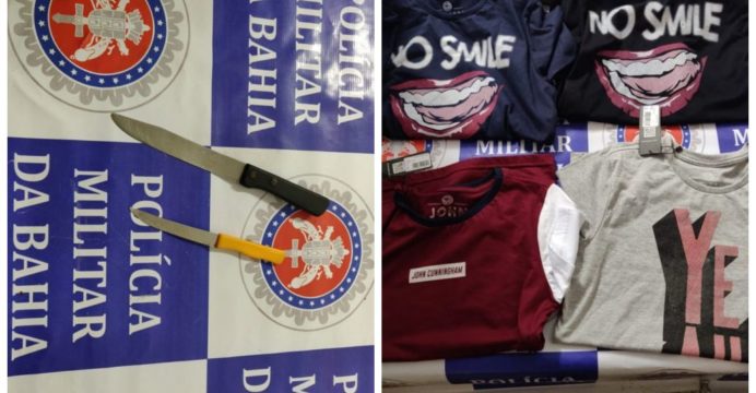 Os policiais fizeram rondas no setor e não localizaram o mesmo, continuaram fazendo diligências no setor comercial do centro da cidade, abordaram o mesmo na Avenida Otaviano Leandro de Moraes, centro de Paulo Afonso, onde o mesmo se encontrava com duas facas e uma sacola plástica com quatro camisas com etiqueta, foi localizada a loja de origem dos produtos e conduziram autor Jonas Ribeiro Pereira, 25 anos e vítima (funcionária da império do jeans) para delegacia, para ser tomada as medidas cabíveis.