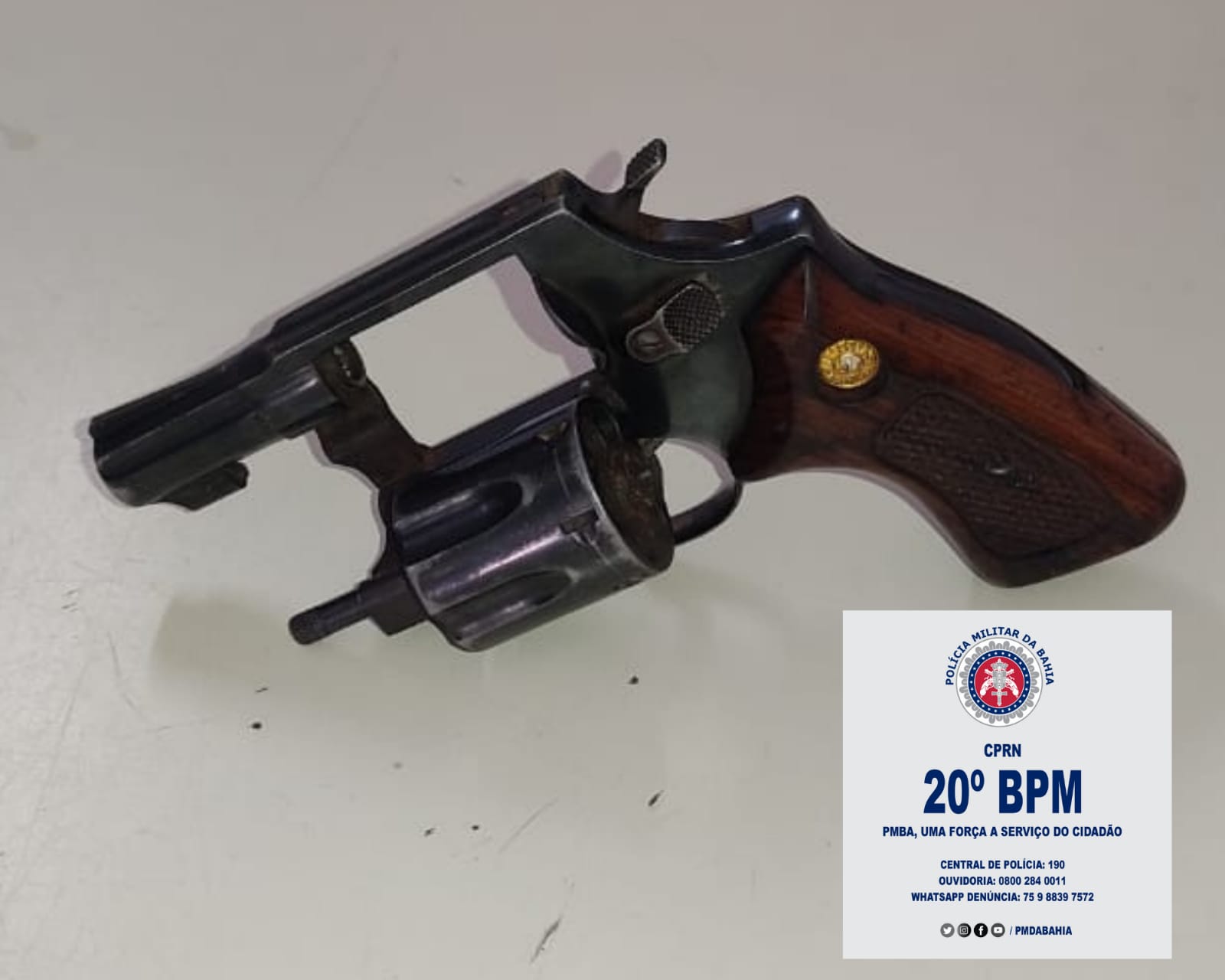 A Polícia Militar através do 20º Batalhão de Paulo Afonso Bahia, realizou a prisão de suspeito por porte ilegal arma de fogo em Paulo Afonso, neste domingo 19 de junho de 2022, por volta das 13h, foram informados por populares que um indivíduo trajando bermuda vermelha e camisa branca, estaria exibindo uma arma tipo revólver em via pública.