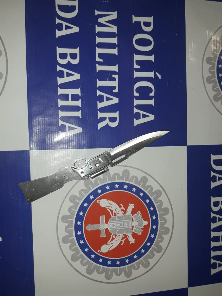 Um popular relatou que a pessoa conhecida por Flávio Pelúcio, estaria na Rua José Oliveira Matos com um faca, e que o mesmo já tem um histórico de confusão na localidade, diante dos fatos, os policiais fizeram rondas no setor, e localizaram o autor, feita a abordagem, encontraram uma faca tipo canivete de marca Stainless Steel Inox.