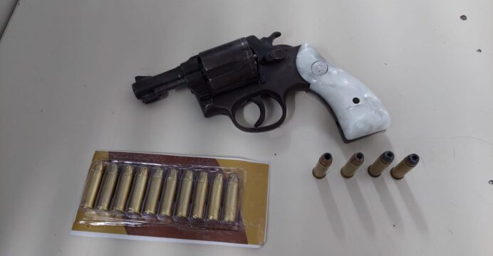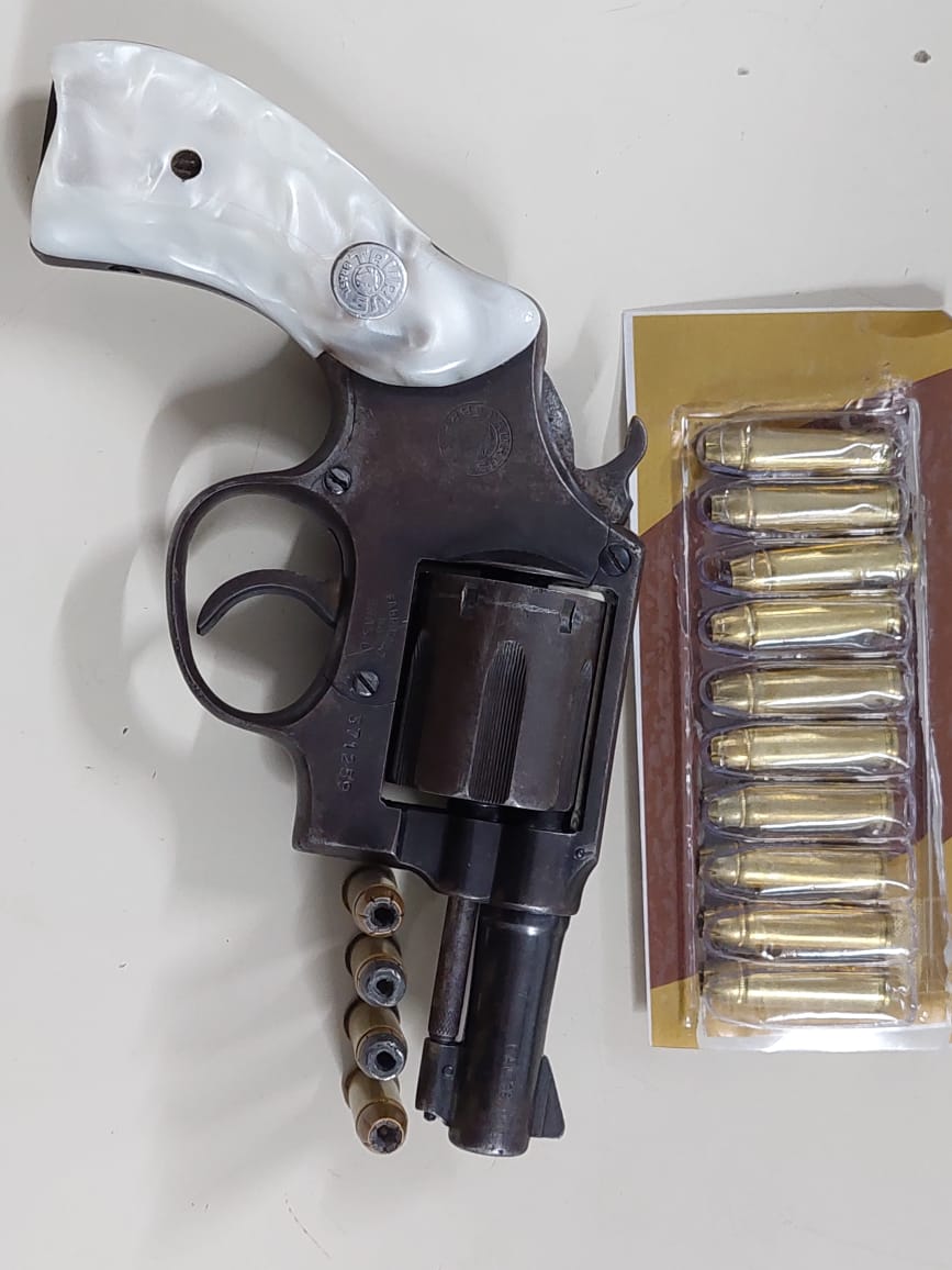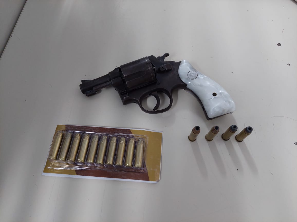 Durante o apoio para vítima tirar seus pertences no guarda roupa, foi localizado uma arma de fogo, revólver. 38 e 14 munições .38 intactas. Emerson Fábio Santos de Assis foi conduzido para Delegacia de Polícia Civil por Posse Ilegal de Arma de Fogo/Cárcere Privado.