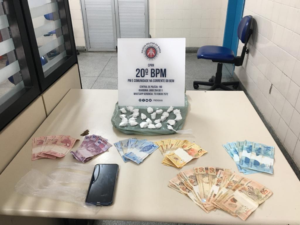 Materiais apreendidos: 26 (vinte e seis) pedras grandes de cor branca aparentando serem cocaína pura 03 (três) sacolas plásticas para embalagem 01 (um) smartphone da marca Redmi na cor azul R$ 1.460,00 (mil quatrocentos e sessenta reais) em espécie;