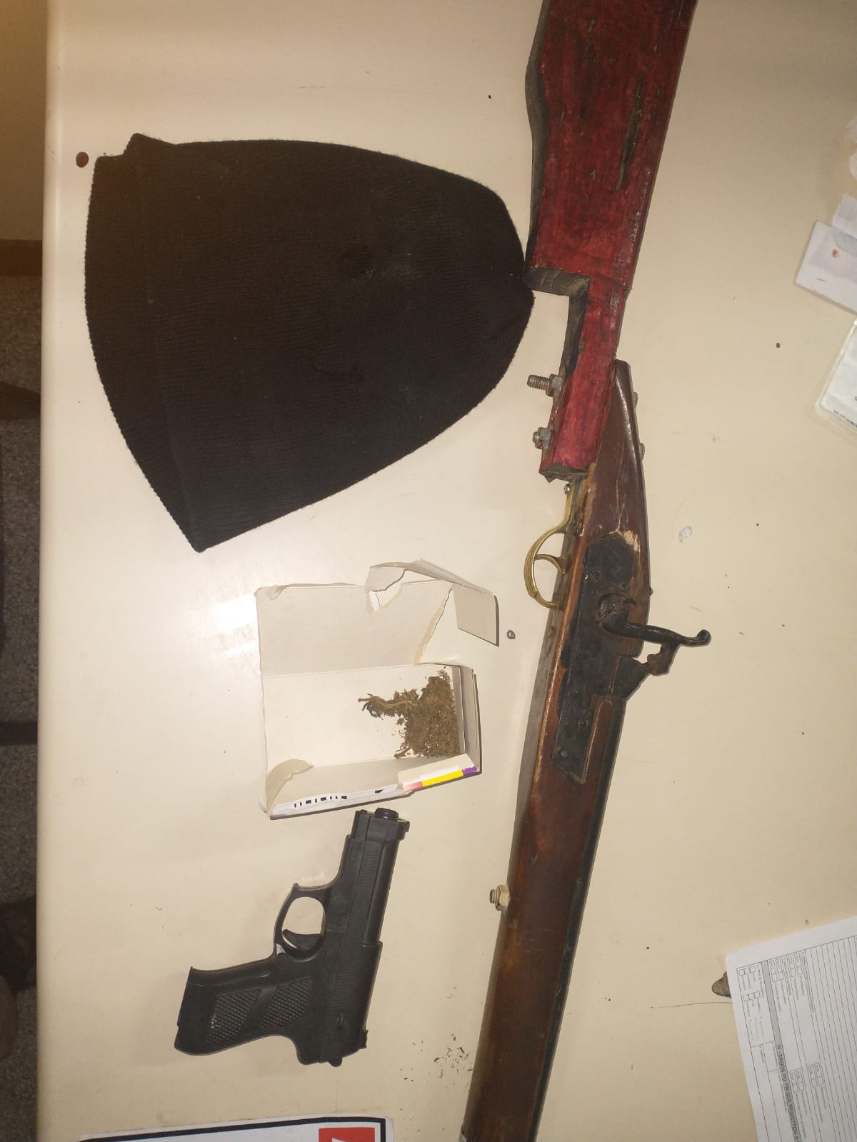 Com apoio de uma Viatura da PM, o acusado foi apreendido junto com os ilícitos e conduzido a Delegacia de Polícia Civil da 18°COORPIN em Paulo Afonso Bahia. MATERIAL APREENDIDO: Uma Espingarda de fabricação caseira com uma caixa de Espoleta, um Simulacro de Pistola, uma Bala Clava e uma porção de substância análoga a Maconha.