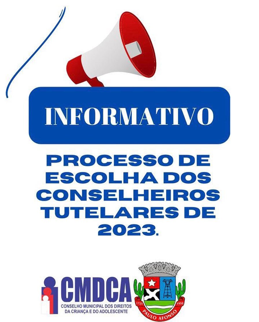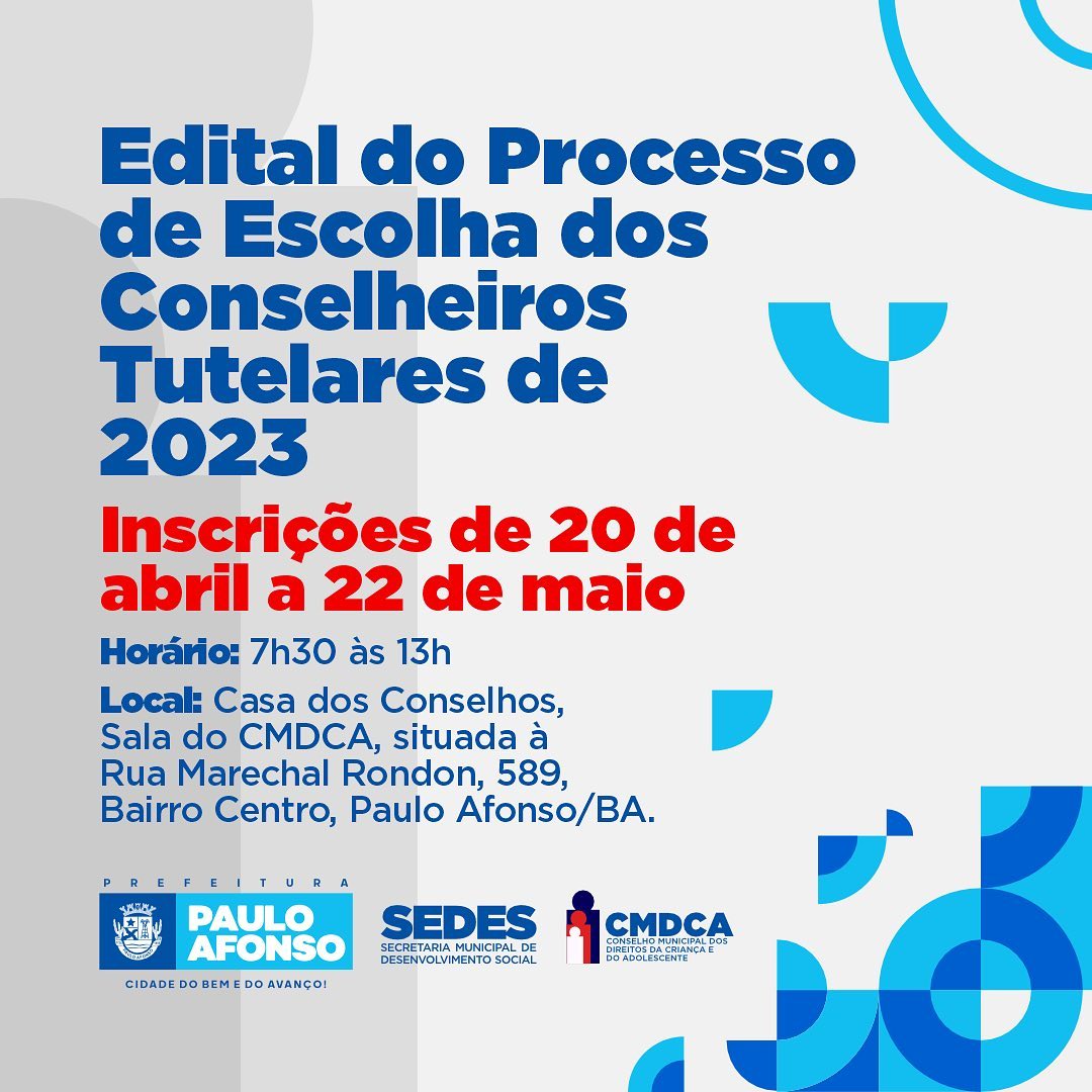 O Conselho Municipal dos Direitos da Criança e Adolescente de Paulo Afonso (CMDCA) publicou o edital para processo de escolha dos conselheiros tutelares de 2023. As inscrições acontecem de 20 de abril a 22 de maio, das 7h30 às 13h, presencialmente, na Casa dos Conselhos, Sala do CMDCA, situada à Rua Marechal Rondon, 589, Bairro Centro, Paulo Afonso/BA.