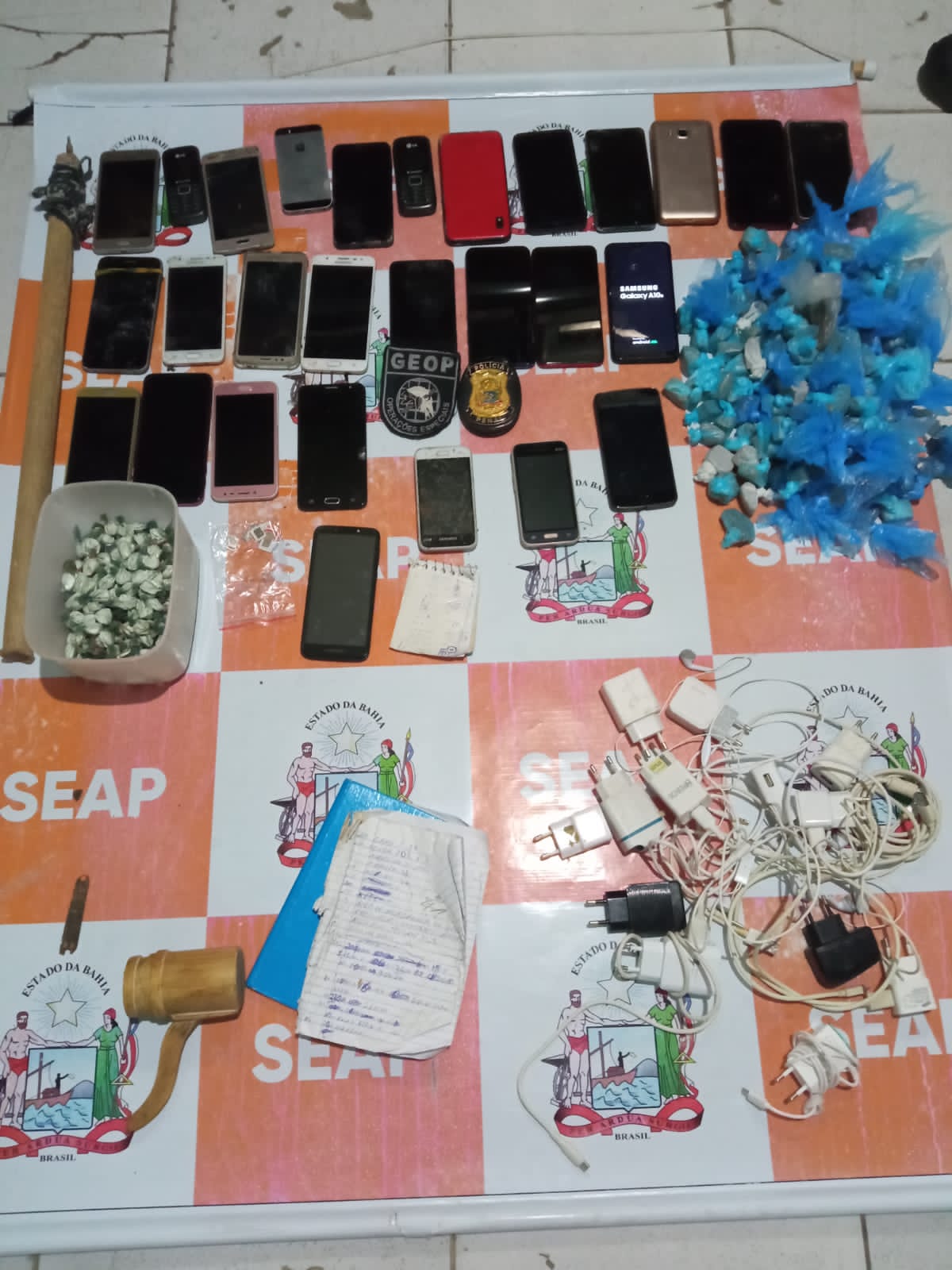 – 27 aparelhos celulares; – 01 chuncho; – 20 carregadores de aparelho celular; – 02 telas de aparelho celular; – 137 trouxinhas de substância análoga à maconha, totalizando 798 gramas; – 255 trouxinhas de substância análoga à cocaína, totalizando 162 gramas; – 11 chips de aparelho celular; – cadernos e folhas com anotações.