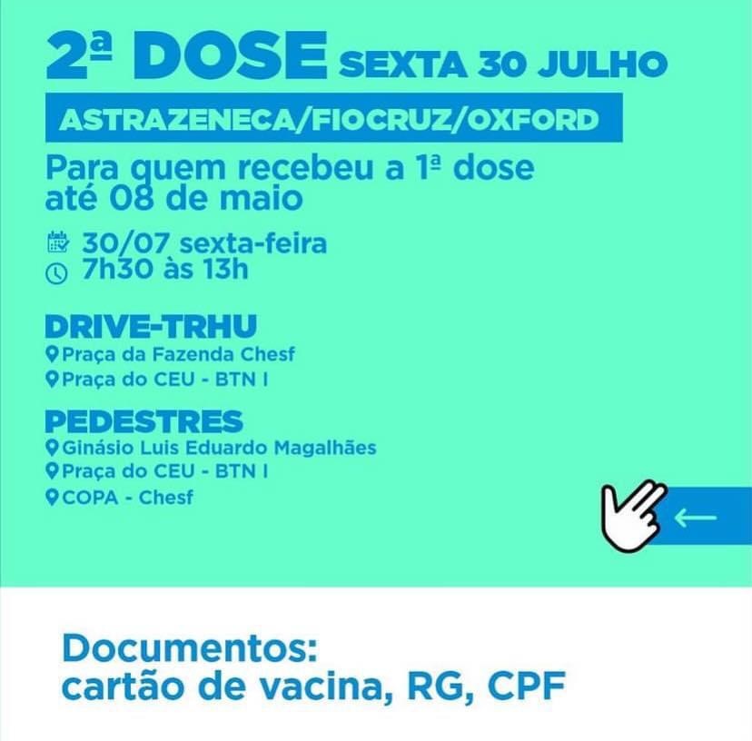 Os pontos de vacinação para aplicação da Astrazeneca seguem via drive thru na Praça da Fazenda Chesf e Praça do CEU – BTN I, e para pedestres no Ginásio Luís Eduardo Magalhães, COPA e Praça CEU no BTN I.