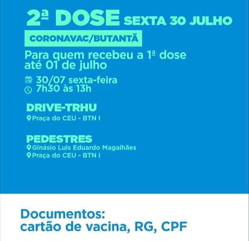 Mais um ciclo de segunda dose é realizado nesta sexta-feira (30), para as pessoas que tomaram a primeira dose da Astrazeneca/Fiocruz/Oxford até o dia 8 de maio e Coronavac/Butantan até o dia 1º de julho. Seguindo as etapas anteriores, a vacinação acontece das 7h30 ás 13h.