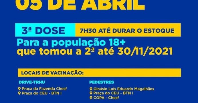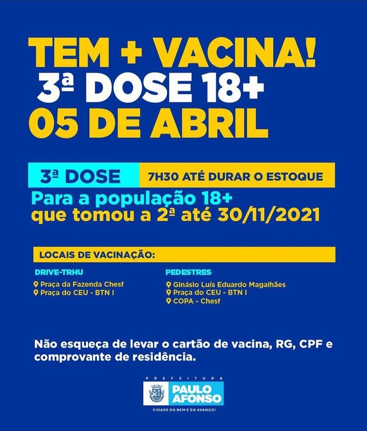 A programação vacinal acontece em dois pontos de drives e três para pedestres. Os drives serão realizados na Praça da Fazenda Chesf e na Praça CEU, no BTN I. Para o público que prefere ir a pé, pode se dirigir ao Clube Operário Paulo Afonso (Copa), no Ginásio Luís Eduardo Magalhães e Praça CEU, no BTN I.