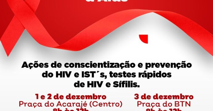 A ação acontece na Praça do Acarajé, localizada na Avenida Getúlio Vargas, nos dias 01 e 02 de dezembro de 2022, e no BTN, no dia 3, ofertando testes rápidos para detecção do HIV/Aids e Sífilis, bem como orientações e conscientização. O horário durante os três dias será das 8h às 12h.