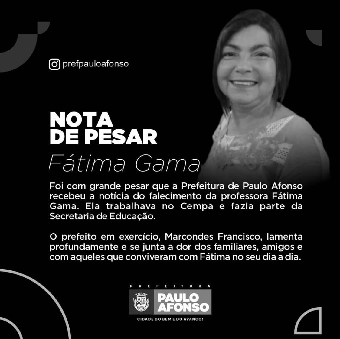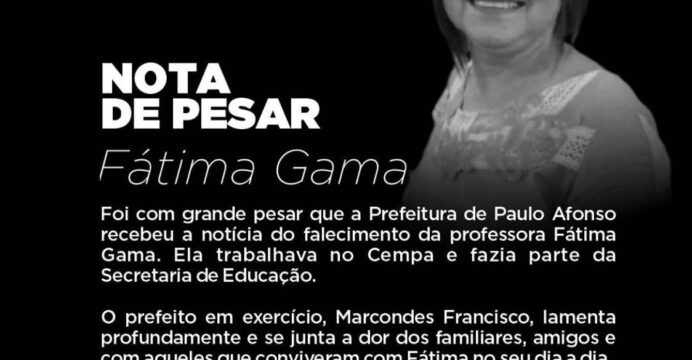 A Secretaria Municipal de Educação informa com tristeza o falecimento da professora Maria de Fátima Gama, que lecionava no Cempa/Centro e na Creche Tenente Iran Barreto. Seu exemplo de profissional dedicada, competência e amiga de todos são marcas que o tempo não apagará. Que Deus a receba na morada celeste.