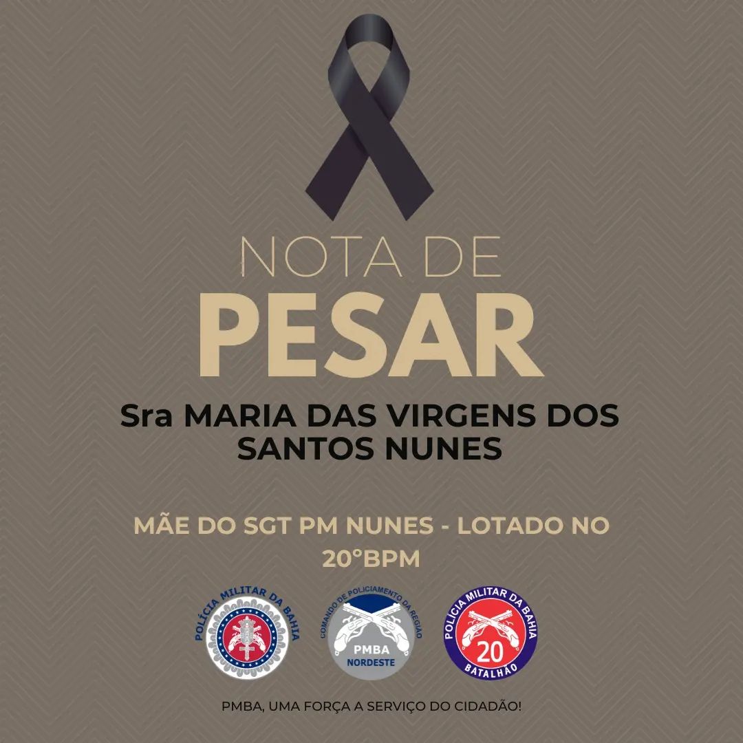 É com grande pesar que o Comandante do 20º BPM comunica o falecimento da Sra Maria das Virgens dos Santos Nunes, mãe do SGT PM NUNES, lotado nesta OPM .
