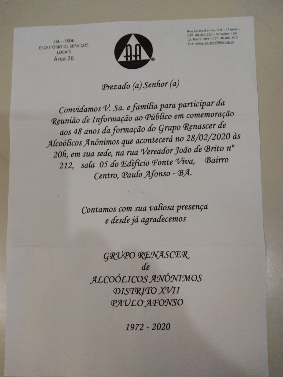 O Grupo Renascer de Alcoólicos Anônimos Distrito XVII realiza mais um evento na cidade de Paulo Afonso Bahia, desta vez o Grupo Renascer convida toda a população para a Festa de Aniversário da entidade que completa 48 Anos de sua formação.