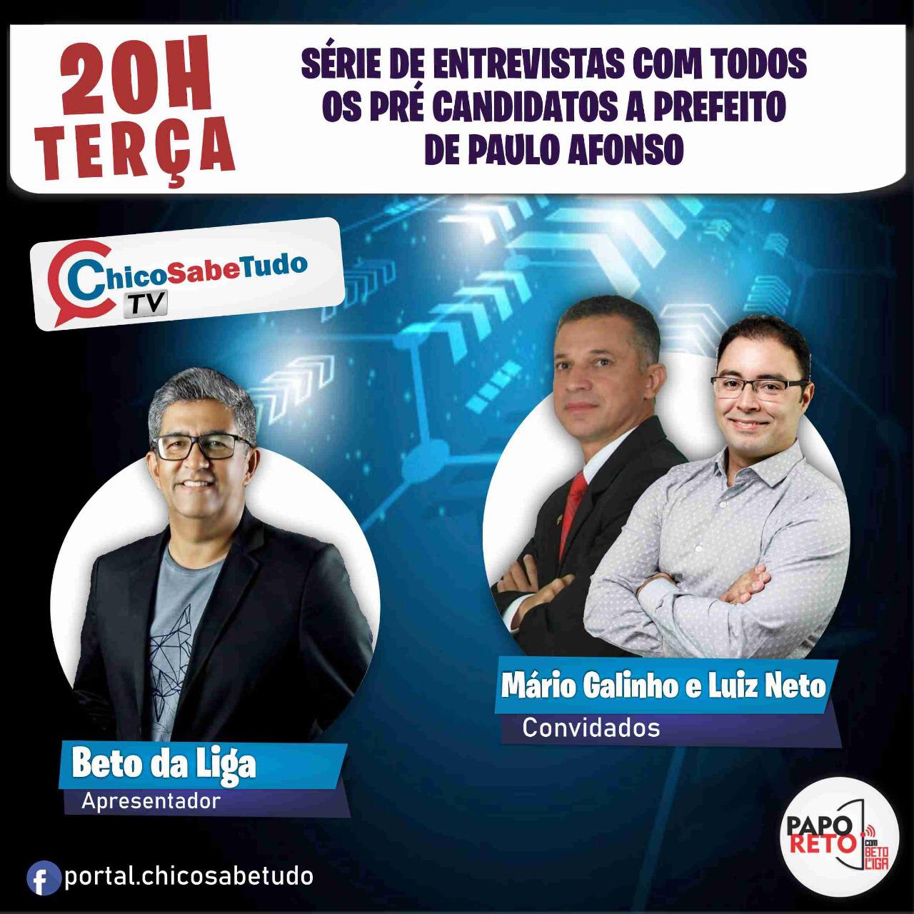 Nesta terça-feira as 20h você tem um encontro marcado com Beto da Liga no Programa Papo Reto. Beto vai receber os Pré-Candidatos a Prefeito Mário Galinho e seu Vice Dr. Neto (Solidariendade).