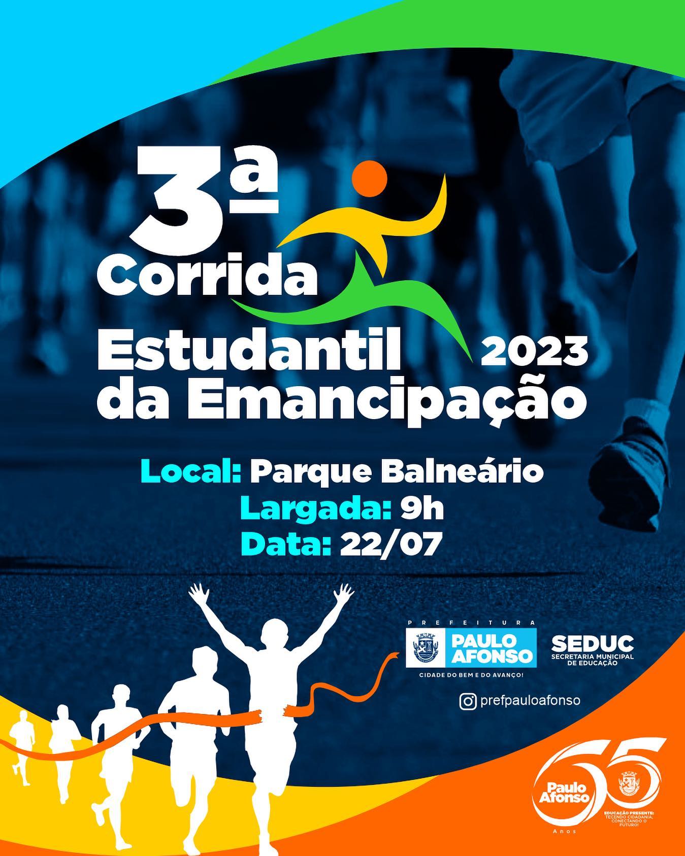 A programação de Emancipação Política, que marca as comemorações dos 65 anos de Paulo Afonso, contará com a realização da 3ª Corrida Estudantil de Emancipação. O evento acontece neste sábado (22), no Parque Balneário, com largada às 9h.