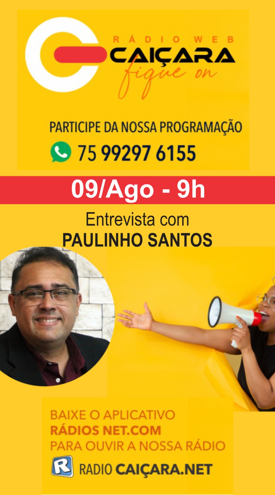 Paulinho Santos Presidente do Conselho Municipal de Cultura de Paulo Afonso Bahia será o entrevistado de amanhã 09 de agosto de 2023 no Programa Sala de Imprensa da @radiowebcaicara. O programa vai ao ar de segunda a sexta-feira das 08h as 10h.