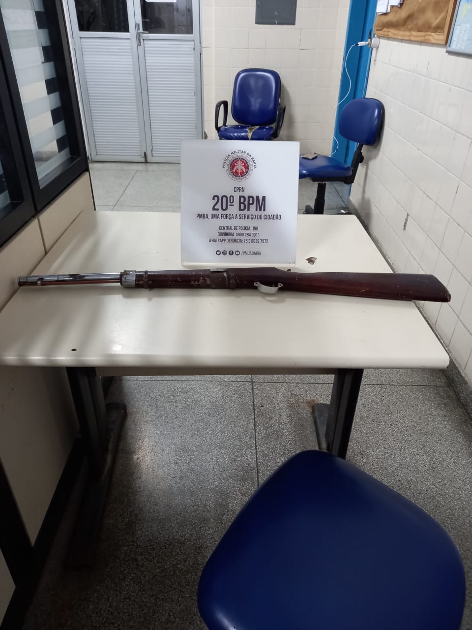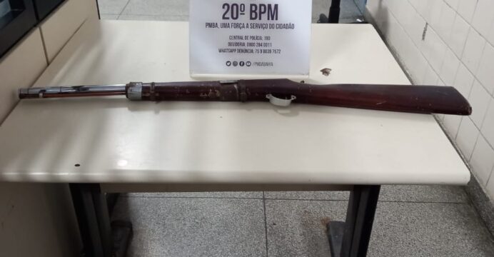 Em contato com a companheira do acusado, a mesma foi ao interior de sua residência pegar a arma e entregou à guarnição, tratando-se de uma espingarda bate bucha. A guarnição deslocou para a Delegacia de Policia para fazer a devida apresentação da arma.