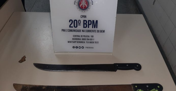 Diante das informações, a guarnição conduziu o suposto autor para prestar esclarecimentos na delegacia. OCORRÊNCIA Nº: 1975/20 MATERIAL APREENDIDO: 02 (duas) armas brancas tipo facão
