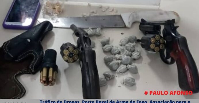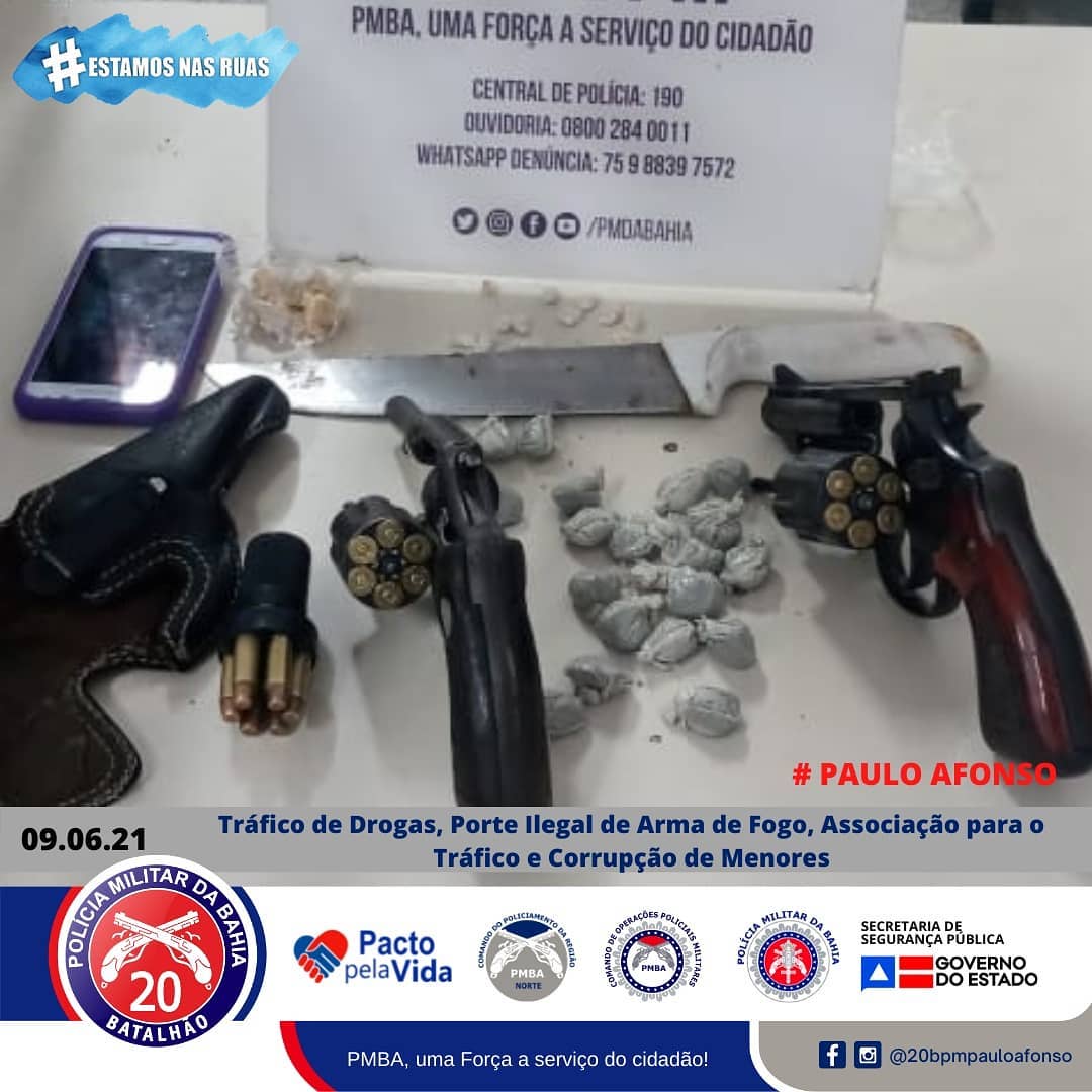 Em 09/06/2021 Policiais Militares da 5ª Cia/PM prenderam em FLAGRANTE um indivíduo por Tráfico de Drogas, Porte Ilegal de Arma de Fogo, Associação para o Tráfico e Corrupção de Menores. O fato aconteceu por volta das 15h10min, na Rua: Beira Rio S/N, Bairro Prainha em Paulo Afonso Bahia.