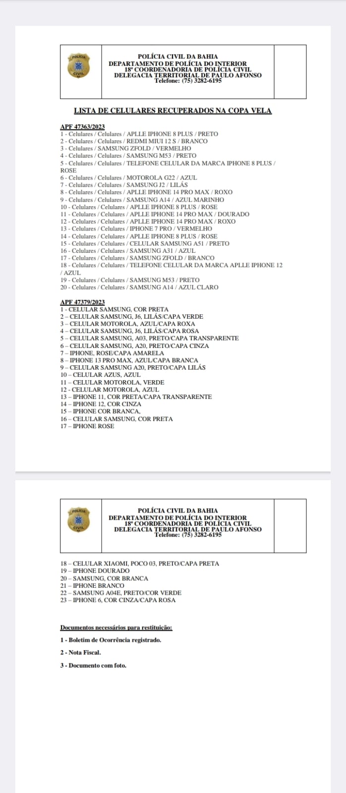 A Polícia Civil da Bahia através do Departamento do Interior da 18ª COORPIN-Delegacia Territorial de Paulo Afonso Bahia, informa a Lista de Celulares Recuperados na Copa Vela 2023. Lembrando que para retirar seu aparelho celular é necessário levar Nota Fiscal e Documento Pessoal.
