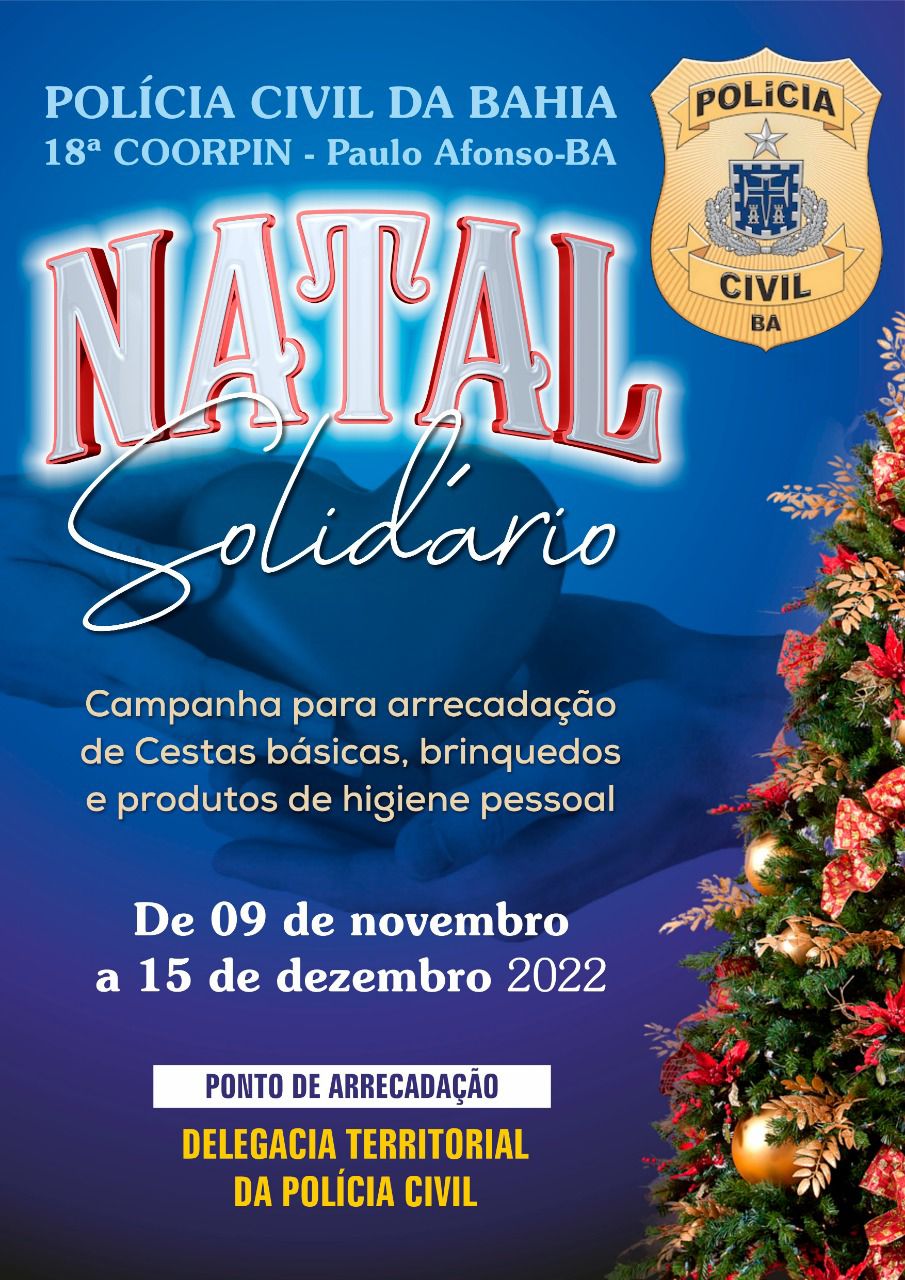 A Polícia Civil da Coordenadoria Regional de Paulo Afonso iniciou campanha de arrecadação de cestas básicas, brinquedos, fraldas e produtos de higiene. A arrecadação será em todas unidades integrantes da Coordenadoria, onde na oportunidade solicita aos cidadãos doações para serem repassados aos mais necessitados, informando que os itens arrecadados serão distribuídos na cidade sede da arrecadação, ou seja, na cidade onde a Delegacia está localizada. Tal campanha busca além de presentear os menos favorecidos, tem também como objetivo aproximar a Polícia Civil da sociedade . “Vamos juntos munidos do espírito Natalino fortalecer o sentimento de caridade , seguindo o que o nosso mestre , Jesus no ensinou”. A arrecadação será até 15 de dezembro e a distribuição será a partir de 16 de dezembro