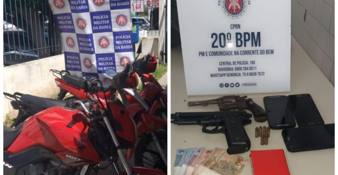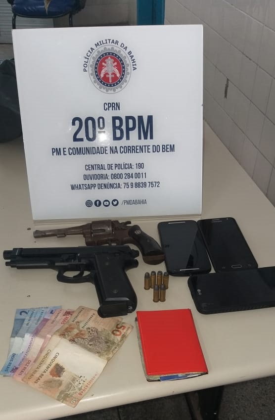 Material apreendido: 01 (um) revolver cal. 32, carregado com 6 (seis) munições intactas, marca Taurus. 01 (um) simulacro de pt 100 03 (três) aparelhos celulares (Motorola, Samsung, LG) 01 (um) paralama traseiro de uma moto titan. R$ 131,00 (cento e trinta e um reais) em especie) 01 (uma) carteira porta cédulas com documentos pessoais e a quantia R$ 185,00 (cento e oitenta e cinco reais). 02 (duas) motociletas Shineray cor vermelha, produtos de furto do pátio da Policia Rodoviária Federal. 01 (uma) motocicleta de marca Honda Titan de cor vermelha, sem placa, tomada de assalto no posto de combustível (posto energia)