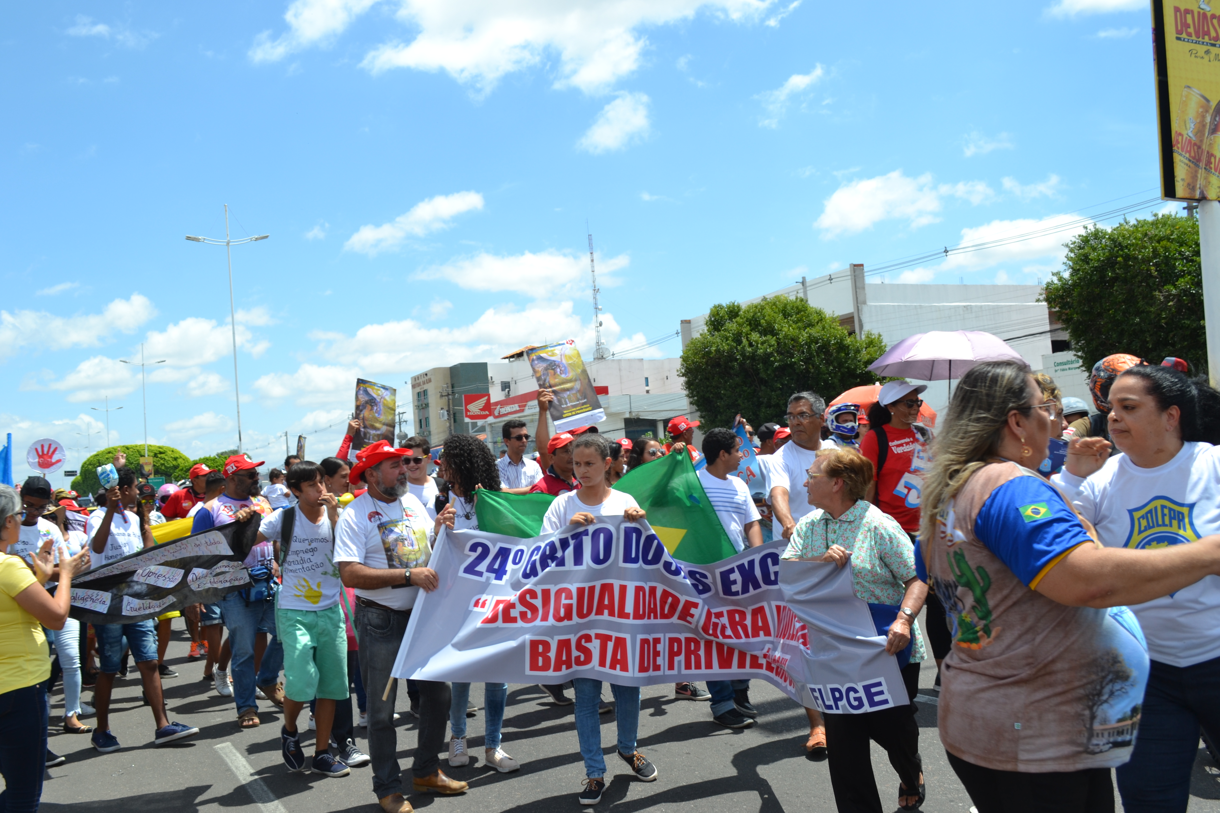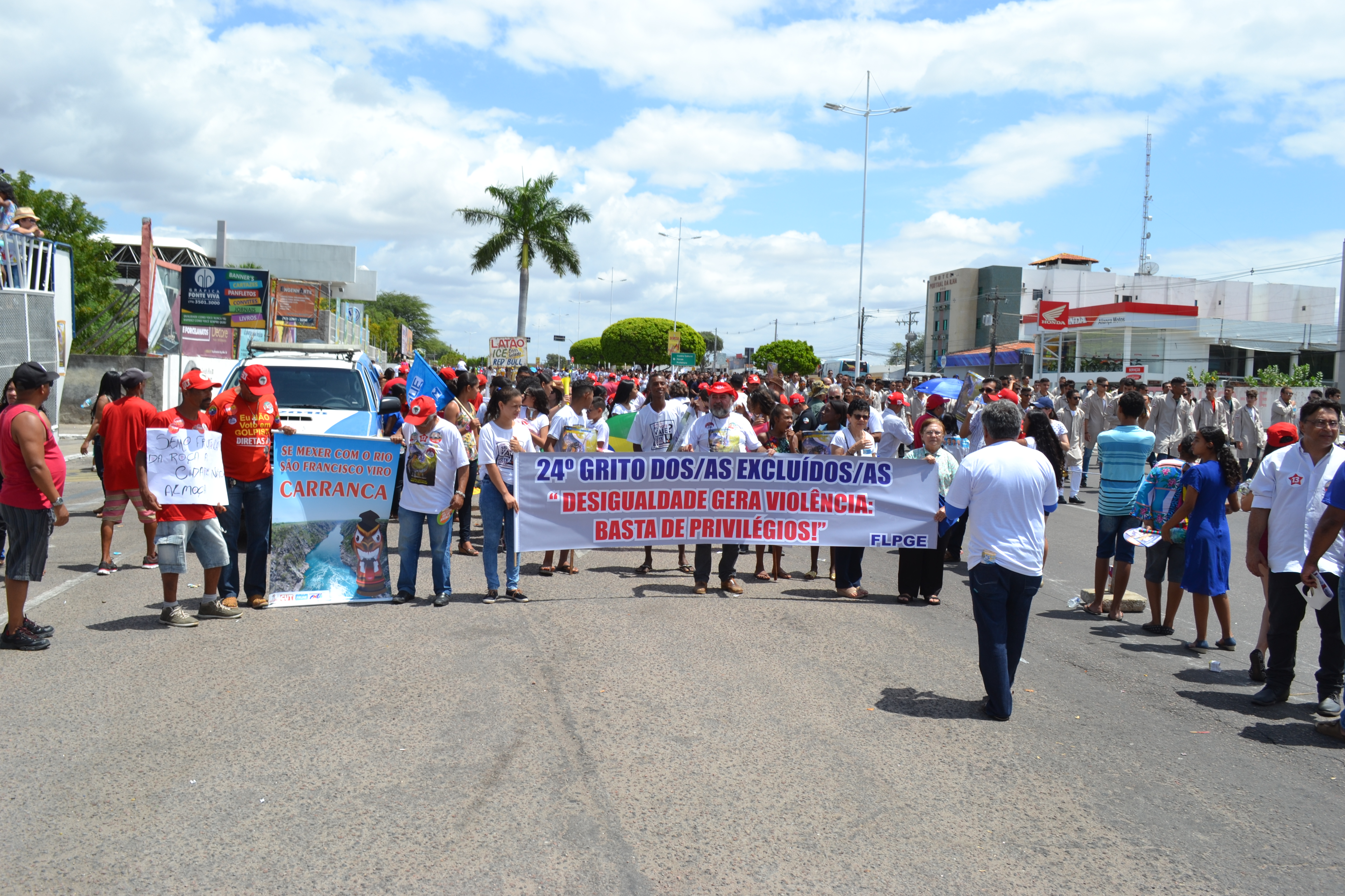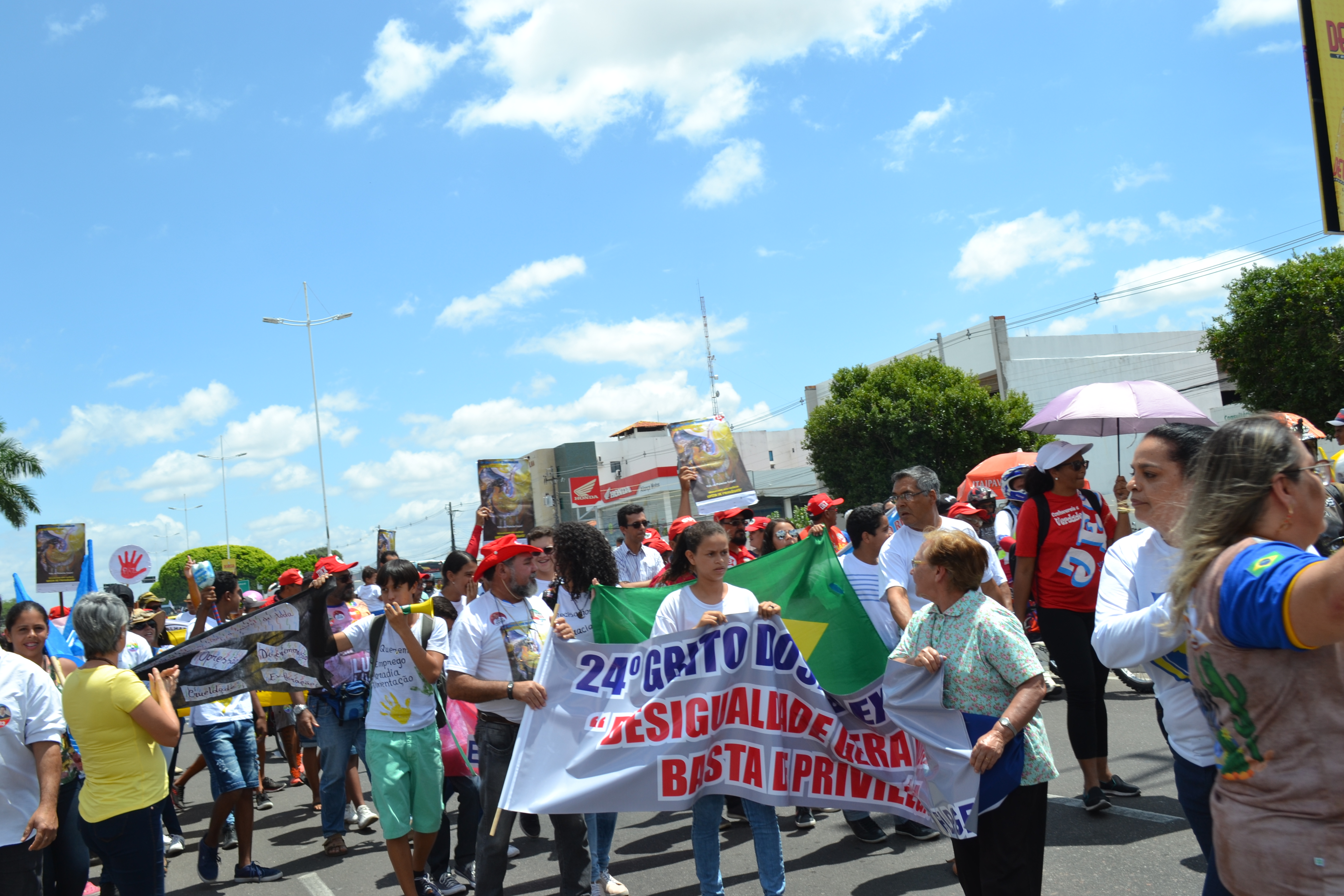 Oficialmente o Grito dos Excluídos chega em sua 24ª edição e acontece sempre no desfile do 7 de Setembro. Esse evento é um chamamento da CNBB-Conferência Nacional dos Bispos do Brasil da Igreja Católica, Sindicatos e Movimentos Populares. O tema escolhido para esse ano de 2018 foi “Vida em Primeiro Lugar”! Desigualdade Gera Violência. Basta de Privilégios. Estavam presentes lideranças políticas, evangélicas, católicas, entre outros movimentos.