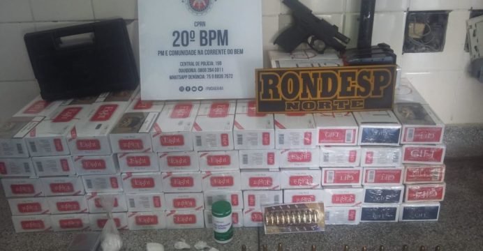 Material apreendido: 01 (uma) pistola.380, 03 (três) carregadores calibre .380 40 (quarenta) munições calibre.380 01 (uma) munição de calibre. 38 01 (um) silenciador 01 (uma) algema 01 (uma) maleta da arma 01 (uma) balança de precisão 20 (vinte) petecas de cocaína 01 (um) pedra grande de cocaína 01 (um) saco contendo pó branco 59 (cinquenta e nove) pacotes de cigarro 03 (três) celulares, sendo: Alcatel, Multilaser e Motorola 01 (um) pote de bicarbonato de sódio.