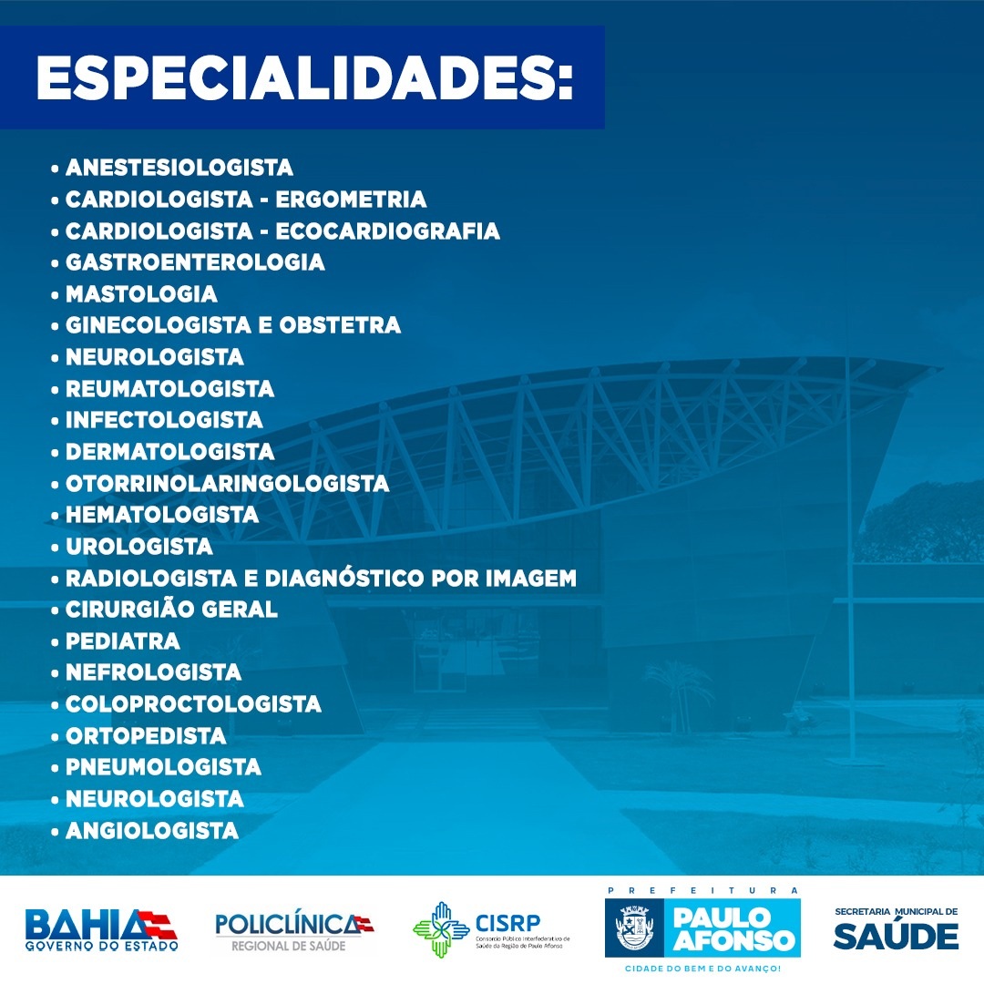 O Consórcio de Saúde da Região de Paulo Afonso (CISRP), responsável pela Policlínica Regional, abriu o processo seletivo simplificado para preenchimento de vagas de médicos, em regime CTL. São diversas especialidades, com carga horária que variam de 12 a 20 horas semanais.